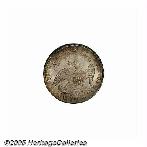 <B>1836<50C> Lettered Edge MS65 NGC.</B></I> O-118, R.3. Apricot, navy-blue, and plum colors drape this lustrous final year Lettered Edge Half. The stars, the top of the cap, and the forehead show incompleteness of strike; most other design details are crisp. A couple of marks on the face, otherwise beautifully preserved.