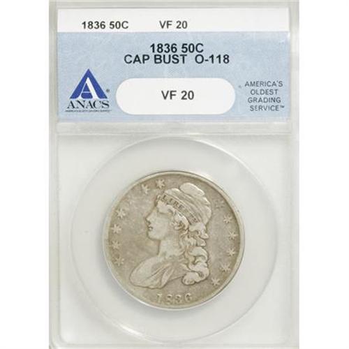 <B>1836 50C Lettered Edge VF20 ANACS.</B></I> O-118. NGC Census: (3/831). PCGS Population (7/792). Mintage: 6,545,000. Numismedia Wsl. Price for NGC/PCGS coin in VF20: $42. (#6169)<BR><BR><B>Coin Engraver:</B> John Reich<BR><BR><b>Shipping:</b> Coins & Currency (<a target="_blank" href="http://www.heritageauctions.com/common/shipping.php">view shipping information</a>)