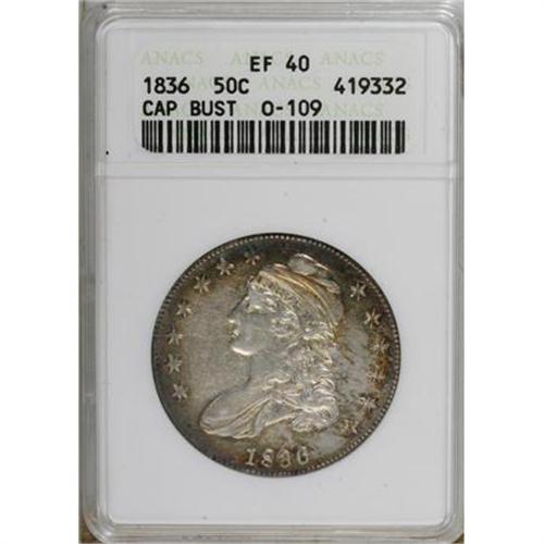 <B>1836 50C Lettered Edge XF40 ANACS.</B></I> O-109. NGC Census: (31/752). PCGS Population (48/627). Mintage: 6,545,000. Numismedia Wsl. Price for NGC/PCGS coin in XF40: $71. (#6169)<BR><BR><B>Coin Engraver:</B> John Reich<BR><BR><b>Shipping:</b> Coins & Currency (<a target="_blank" href="http://www.heritageauctions.com/common/shipping.php">view shipping information</a>)