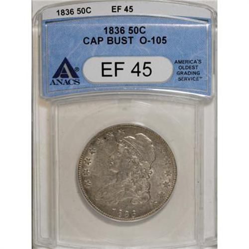 <B>1836 50C Lettered Edge XF45 ANACS.</B></I> . O-105. NGC Census: (71/711). PCGS Population (78/617). Mintage: 6,545,000. Numismedia Wsl. Price for NGC/PCGS coin in XF45: $195. (#6169)<BR><BR><B>Coin Engraver:</B> John Reich<BR><BR><b>Shipping:</b> Coins & Currency (<a target="_blank" href="http://www.heritageauctions.com/common/shipping.php">view shipping information</a>)