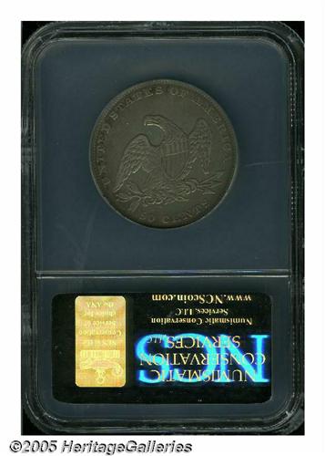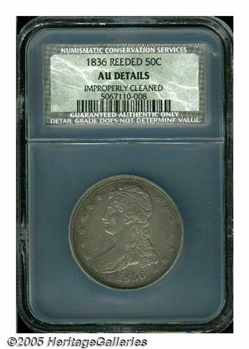 <B>1836<50C> Reeded Edge AU Details, Improperly Cleaned, NCS.</B></I> A subdued but relatively lightly hairlined dove-gray example. The curls and plumage demonstrate only moderate wear. A few minor rim dings are of little significance. A popularly hoarded issue that has an ultra-low mintage of 1,200 pieces.