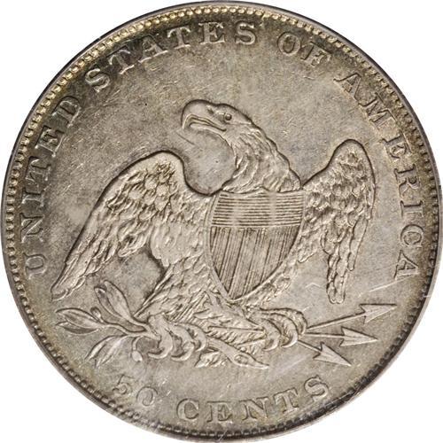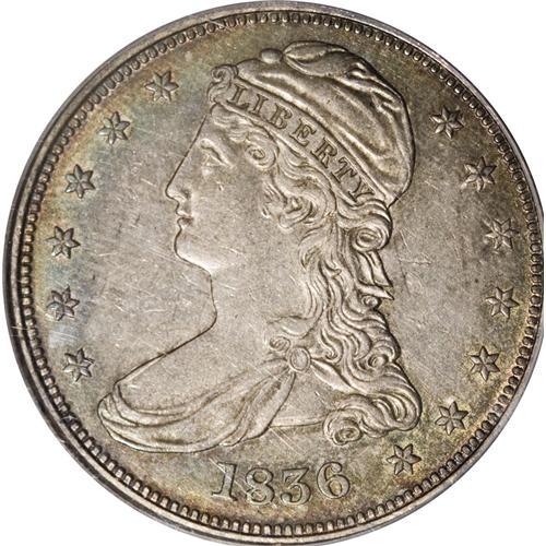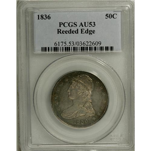<B>1836 50C Reeded Edge AU53 PCGS.</B></I> A rare and historic transitional issue, one of a reported 1,200 pieces struck, the first of its kind struck on the Mint's new steam-operated presses. The wholly original surfaces are framed in golden and sea-green toning. For pedigree purposes, there are two small contact marks in the right obverse field. Still, a colorful, highly attractive piece. Population: 11 in 53, 53 finer (12/06).<BR><BR><b>Shipping:</b> Coin/Currency (<a target="_blank" href="http://www.heritageauctions.com/common/shipping.php">view shipping information</a>)