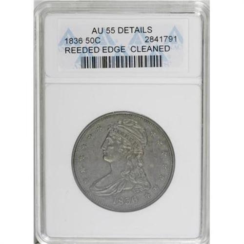 <B>1836 50C Reeded Edge--Cleaned--ANACS. AU55 Details.</B></I> This ultra low-mintage issue is historic, since it was the first half dollar variety struck on a steam press. Deep olive-brown toning conceals a past moderate cleaning and a few wispy obverse field marks. A sharply defined example with only traces of highpoint friction.<BR><BR><B>Coin Engraver:</B> Christian Gobrecht<BR><BR><b>Shipping:</b> Coins & Currency (<a target="_blank" href="http://www.heritageauctions.com/common/shipping.php">view shipping information</a>)