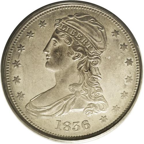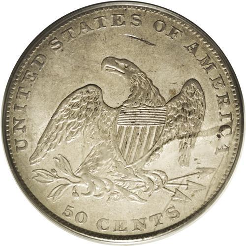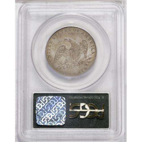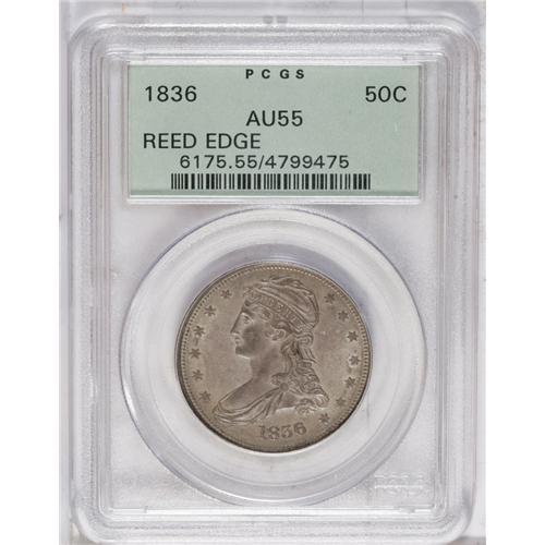 <B>1836<50C> Reeded Edge AU55 PCGS.</B></I> A well struck and distraction-free example of this historic coinage, the first issue in U.S. numismatics to be struck on the Mint's new steam press. Numismatic scholars and researchers have spilled much ink debating whether these coins were regular issues or patterns: They are listed in the Judd pattern reference and on www.uspatterns.com, but many authorities believe they are regular issues (possibly made later than 1836), and most of the known examples are circulated. This example shows lovely dove-gray surfaces and a generally pleasing strike, with weakness on the eagle's claws. A tick above the eagle's head is noted. Just a touch of rub away from Mint State, certified in a green-label holder. Population: 17 in 55, 37 finer (7/06).