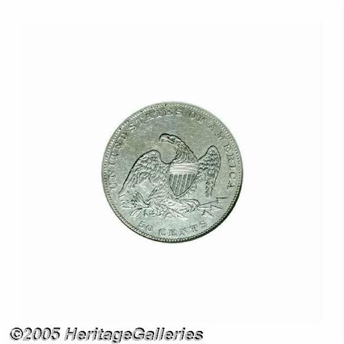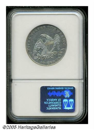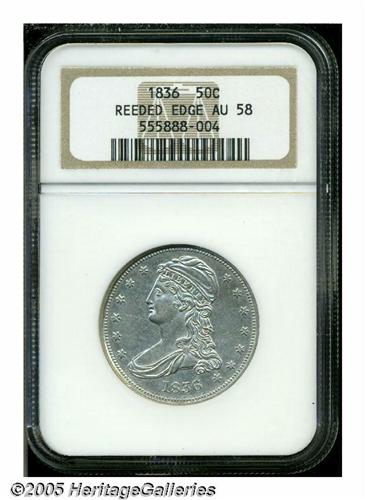 <B>1836<50C> Reeded Edge AU58 NGC.</B></I> Multiple offerings of this first year issue in no way lessen its rarity and historical importance as the initial Half Dollar produced from the Mint's (then) state-of-the-art steam presses. This example shows just a trace of wear over bright, untoned surfaces that still retain bright, semi-reflective tendencies.