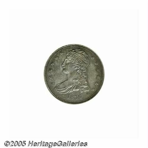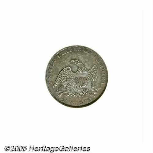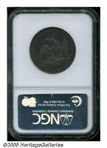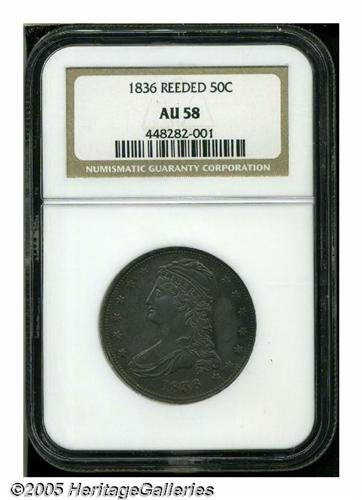 <B>1836<50C> Reeded Edge AU58 NGC.</B></I> Only 1,200 Reeded Edge halves were struck beginning on November 8, 1836 on the mint's new steam presses. This example shows evidence of light circulation with rather deep gray and rose patina covering both sides and no distracting marks. A truly Choice AU specimen.