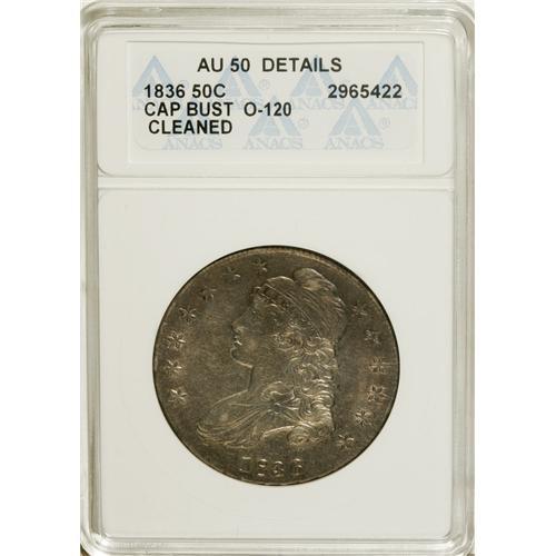 <B>1836 50C Reeded Edge--Cleaned--ANACS. AU50 Details.</B></I> O-120. NGC Census: (9/92). PCGS Population (20/65). Mintage: 1,200. Numismedia Wsl. Price for NGC/PCGS coin in AU50: $2,850. (#6175)<BR><BR><b>Shipping:</b> Coins & Currency (<a target="_blank" href="http://www.heritageauctions.com/common/shipping.php">view shipping information</a>)