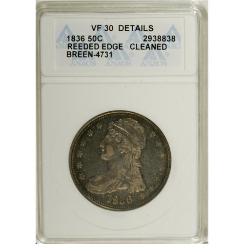 <B>1836 50C Reeded Edge--Cleaned--ANACS. VF30 Details.</B></I> Breen-4731. Retoned gold and blue with occasional rouge accents. This moderately worn and glossy survivor is one of only 1,200 examples coined. <BR><I>From The Twin Hollows Collection, Part Two.</B></I><BR><BR><b>Shipping:</b> Coins & Currency (<a target="_blank" href="http://www.heritageauctions.com/common/shipping.php">view shipping information</a>)