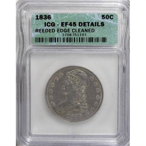 <B>1836 50C Reeded Edge--Cleaned--ICG. XF45 Details.</B></I> Wispy hairlines cross the well struck, lightly worn devices, while the deep blue-gray fields exhibit soft, uniform luster. Still, a desirable representative of this historic issue.<BR><I>From The Yoder Family Collection, Part One.</B></I><BR><BR><B>Coin Engraver:</B> Christian Gobrecht<BR><BR><b>Shipping:</b> Coins & Currency (<a target="_blank" href="http://www.heritageauctions.com/common/shipping.php">view shipping information</a>)