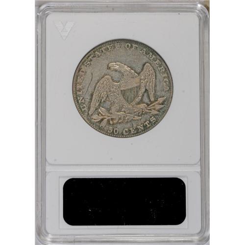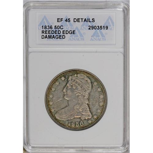 <B>1836<50C> Reeded Edge--Damaged--ANACS. XF45 Details.</B></I> Long, deep abrasions appear in the left obverse and left reverse fields. Otherwise, nicely struck with hints of original luster and pleasing yellow-green and violet toning.