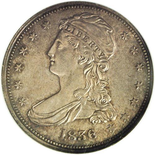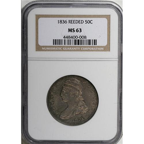 <B>1836 50C Reeded Edge MS63 NGC.</B></I> Like other well-known prototypes that have found their way into the mainstream of American numismatics (1856 Flying Eagles and 1879 Flowing Hair Stellas come to mind), the 1836 Reeded Edge half dollar is technically a pattern issue. However, the issue's mintage of 1,200 coins, and business strike production format, suggest that this issue may have been intended for actual circulation. Indeed, many of the survivors are well worn. These coins were struck on the recently installed Thonnelier steam press, and they became the first steam coinage produced at the second United States Mint building. Incidentally, the very first Thonnelier press spent many years residing in Philadelphia's Franklin Institute, and today is located in the ANA Money Museum in Colorado Springs.<BR> This specimen is fully lustrous with soft, frosty surfaces beneath intermingled heather, gray, and champagne toning. Although the luster is a little subdued, the surfaces are excellent quality for the grade. Census: 5 in 63, 5 finer (11/06).<BR><BR><b>Shipping:</b> Coin/Currency (<a target="_blank" href="http://www.heritageauctions.com/common/shipping.php">view shipping information</a>)