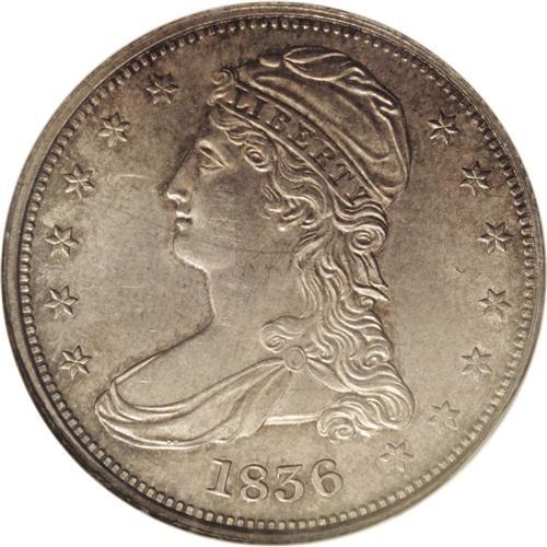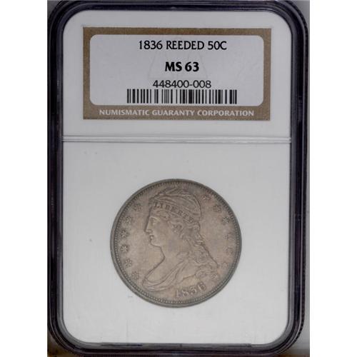 <B>1836 50C Reeded Edge MS63 NGC.</B></I> Technically a pattern issue, however, the mintage of 1,200 coins and business strike production format suggest that this issue may have been intended for actual circulation. Indeed, many of the survivors are well worn. These coins were struck on the recently installed Thonnelier steam press, and they became the first steam coinage produced at the second United States Mint building. Incidentally, the very first Thonnelier press spent many years residing in Philadelphia's Franklin Institute, and today is located in the ANA Money Museum in Colorado Springs.<BR> This specimen is fully lustrous with soft, frosty surfaces beneath intermingled heather and champagne toning. Although the luster is a little subdued, the surfaces are excellent quality for the grade.