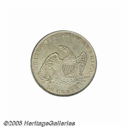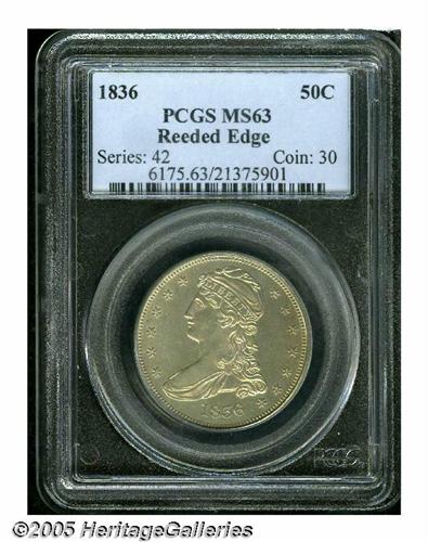 <B>1836<50C> Reeded Edge MS63 PCGS.</B></I> An important example of this very scarce coin. The surfaces are generally bright silver in color with just a hint of gold and we note ample luster in the fields. The strike is quite sharp with Liberty's cascading curls well formed and brought up well by the dies. On the reverse we note a tiny die crack on the left side of the first T in STATES and another just past the final S dangling down from the rim. The 1836 reeded edge half dollar was selected as the first issue to be struck on the Philadelphia Mint's new steam coinage press. After Mint Engraver Kneass had his fatal stroke in 1835, the Mint appointed Christian Gobrecht to be the Engraver. Gobrecht slightly modified the previous Reich/Kneass designs used for the Bust half dollars by dropping the reverse motto (as had been done on quarters in 1831 and gold coinage in 1834) and by expanding the denomination from 50 C. to 50 CENTS. It is believed that 1,200 of these were struck beginning on November 8, 1836 and these were intended for general circulation. This is borne out by the PCGS <I>Population Report</B></I> which shows the vast majority of survivors to be circulated. Obtaining an example in Uncirculated condition is quite a challenge for the specialist. This particular coin shows the benefits of the steam presses, with well struck devices and finely executed details throughout. With the steam presses, an open collar could no longer be used, thus the edge lettering was dropped in favor of a reeded edge. The closed collar held the planchet tight during striking, forcing the movement of the coin metal into the dies instead of outward. Coinage struck on the new steam presses was more uniform in thickness, striking quality and more difficult to counterfeit successfully. Always in strong collector demand, and a great opportunity to obtain a very attractive example of this issue. Population: 6 in 63, 3 finer (6/05).