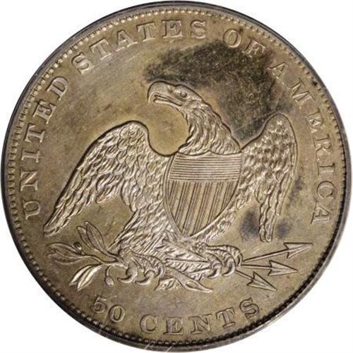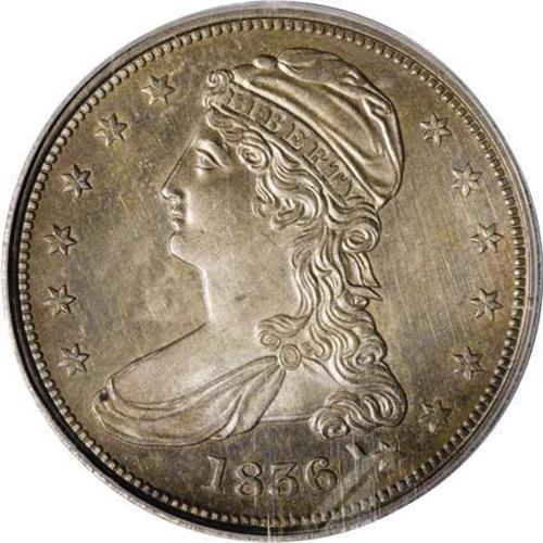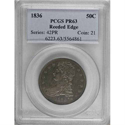 <B>1836 50C Reeded Edge PR63 PCGS.</B></I> 1836 Reeded Edge halves are famous as business strikes as only 1,200 pieces were minted. These pieces are widely sought out by collectors in all grades as the first examples of the new half dollar type and the first mass-produced denomination on steam presses. These halves are occasionally available in a wide range of grades, and are always of interest to collectors. <BR> However, little thought is given to the proofs known of this date and type as they are so rare that most collectors have overlooked them. In fact, many do not even know of their existence. Estimates vary from 10 to 12 proofs struck of the 1836. This piece is among the finest known. The fields have a confirmed reflectivity that is plentifully evident through the multiple layers of purple, golden, and blue toning that are splashed over each side. The striking details are strong, but lack absolute fullness, apparently a common trait among several of the known proof 1836 halves. Mint officials were obviously unfamiliar with the striking pressure necessary with the new steam press to completely bring up all the details on these pieces. However, this piece is much stronger defined than the Garrett-Auction '80 coin. Diagnostically correct also, there is a short die crack to the right of the final S in STATES that is present on all genuine proofs of this issue, a trait that is also present on business strikes but is significantly longer on those later strikings.<BR><BR><B>Coin Engraver:</B> Christian Gobrecht<BR><BR><b>Shipping:</b> Coins & Currency (<a target="_blank" href="http://www.heritageauctions.com/common/shipping.php">view shipping information</a>)