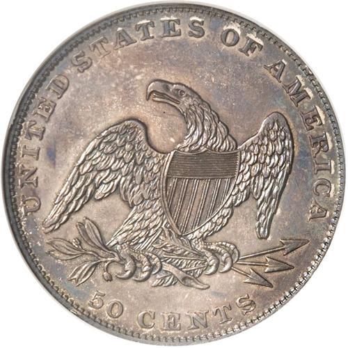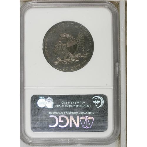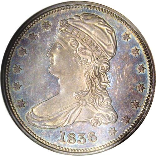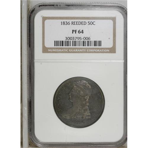 <B>1836 50C Reeded Edge PR64 NGC.</B></I> There is currently no accurate Census of proof 1836 Reeded Edge half dollars in existence, to the best of our knowledge. It is probably a reasonable estimate that fewer than 20 such coins exist at all grade levels, with only two or three Gem quality pieces known. In his <I>Complete Encyclopedia,</B></I> Walter Breen estimated a total population of "at least 12 proofs." A decade earlier, Breen commented in his <I>Proof Encyclopedia:</B></I> "I know of at least eleven different examples, a few more probably exist."<BR> This is a remarkably attractive example with natural steel-blue and lilac-gray toning blended over both surfaces, deeper on the obverse and lighter on the reverse. Light surface scratches are visible beneath the toning, especially on the obverse, preventing a Gem assessment by NGC. The fields are fully mirrored with obvious cameo contrast, although such a designation has not been assigned to this piece due to the toning. Clearly, the toning is consistent with those pieces found in old collections.<BR> According to a letter from Mint Director Robert M. Patterson to Treasury Secretary Levi Woodbury, the new reeded edge half dollars were first coined on November 8, 1836. It was on this date that 10 pieces, called "specimens," were delivered by Patterson to Woodbury. The language suggests that these pieces were proofs, or otherwise special strikes. Given the number that are known today, additional proofs must have been struck before the regular coinage commenced. These pieces were the first coins produced on the new steam-operated coinage press, although the coinage had been anticipated for quite some time. The famous Steam Press Token indicates a date of March 23, 1836 while a letter dated September 6, 1836 from Patterson to George Newbold, president of the Bank of America in New York, anticipates the coinage of half dollars by steam in just a few days. The cataloger for the Eliasberg Collection in 1997 references an additional letter dated November 11, 1836, with a notation that 32 coins were sent to Newbold. Perhaps these pieces were additional proof examples, giving a total proof mintage of 42 pieces. Though we have no record of a proof mintage today, the figure of 42 pieces is consistent with the number known today. The design for the Reeded Edge half dollars was similar to John Reich's earlier Capped Bust design, with slight refinements made by Christian Gobrecht. Of course, the change from a lettered edge to a reeded edge was the biggest improvement. Mint Director Patterson remarked that the new "Close Collar" gave a mathematical quality to the diameter of these coins, and it was this Close Collar that also imparted the reeded edge. This new device had actually been introduced several years earlier on the gold coinage in 1829, but the combination of steam power and use of the Close Collar first took place in 1836.<BR> The entire history surrounding the first steam press is an interesting story, briefly told by Cathy L. Clark in the March 2000 issue of The Numismatist. Her article, "Steam Power: A Pressing Issue" discusses the Thonnelier steam press in conjunction with a display at the American Numismatic Association Museum. The original steam press survives to this day and is on display at the ANA in Colorado Springs, Colorado.<BR><BR><b>Shipping:</b> Coins & Currency (<a target="_blank" href="http://www.heritageauctions.com/common/shipping.php">view shipping information</a>)