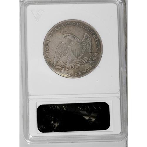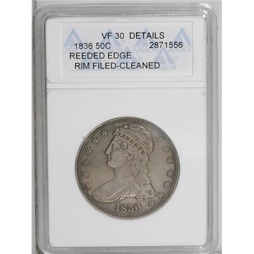<B>1836<50C> Reeded Edge--Rim Filed, Cleaned--ANACS. VF30 Details.</B></I> This well known scarcity has a recorded mintage of just 1,200 pieces. The present cream-gray and russet-brown example has rim repairs near 12 o'clock on the obverse and 7 o'clock on the reverse. The surfaces are granular, and a few minor rim dings are noted.