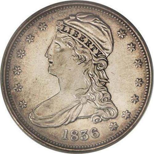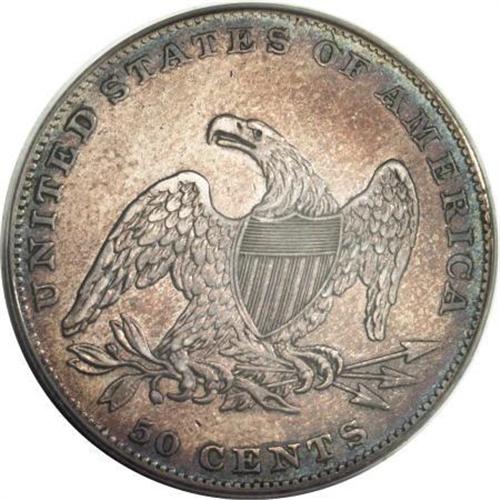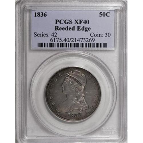 <B>1836 50C Reeded Edge XF40 PCGS.</B></I> The obverse has only light gold toning, but the reverse border exhibits deep aqua-blue, and the reverse field is autumn-brown. A sharply detailed representative of this low mintage collector favorite. Slightly glossy, and a couple of faded marks rest unobtrusively on the upper right reverse field.<BR><I>From The Yoder Family Collection, Part One.</B></I><BR><BR><B>Coin Engraver:</B> Christian Gobrecht<BR><BR><b>Shipping:</b> Coins & Currency (<a target="_blank" href="http://www.heritageauctions.com/common/shipping.php">view shipping information</a>)