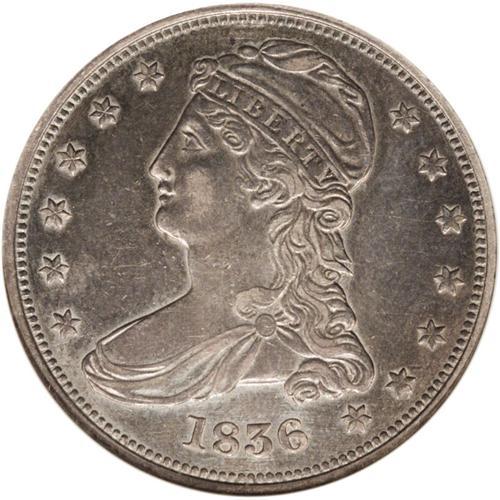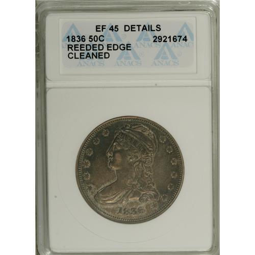 <B>1836 50C Reeded Edge--Cleaned--ANACS. XF45 Details.</B></I> The tiny mintage of 1,200 pieces has made the 1836 Reeded Edge a long-time favorite for both collectors and accumulators. This moderately glossy piece has medium golden-brown, lilac, and electric-blue patina. The fields possess scattered minor marks. A sharp example of this popular variety.<BR><BR><b>Shipping:</b> Coin/Currency (<a target="_blank" href="http://www.heritageauctions.com/common/shipping.php">view shipping information</a>)