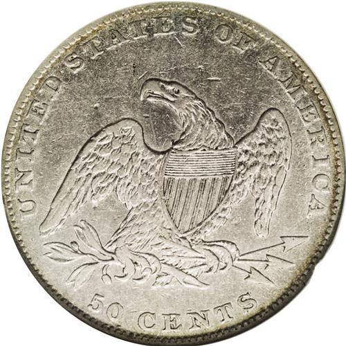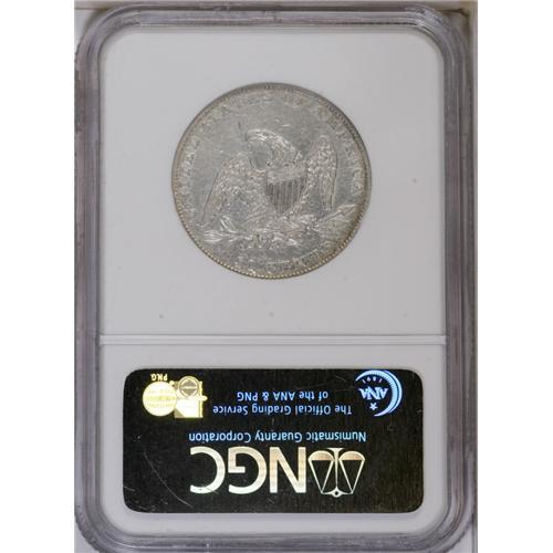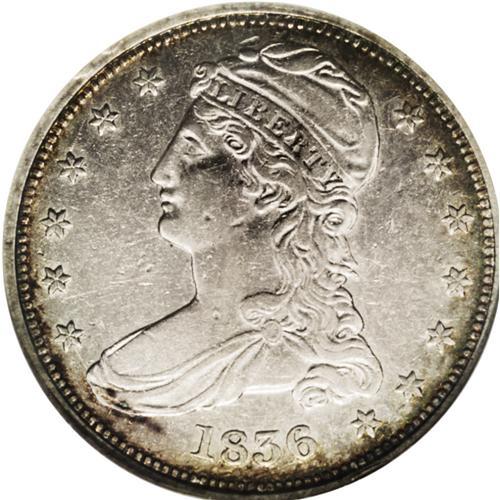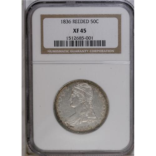 <B>1836<50C> Reeded Edge XF45 NGC.</B></I> The 1836 Reeded Edge half dollar is historic, since it departs from the Mint's former tradition of open collar production. But the real reason it is hoarded has more to do with its minuscule reported mintage of 1,200 pieces. This bright example has a peripheral blush of golden-brown toning. Some luster remains, and the surfaces are only moderately marked. A minor obverse rim ding is detected at 4:30.
