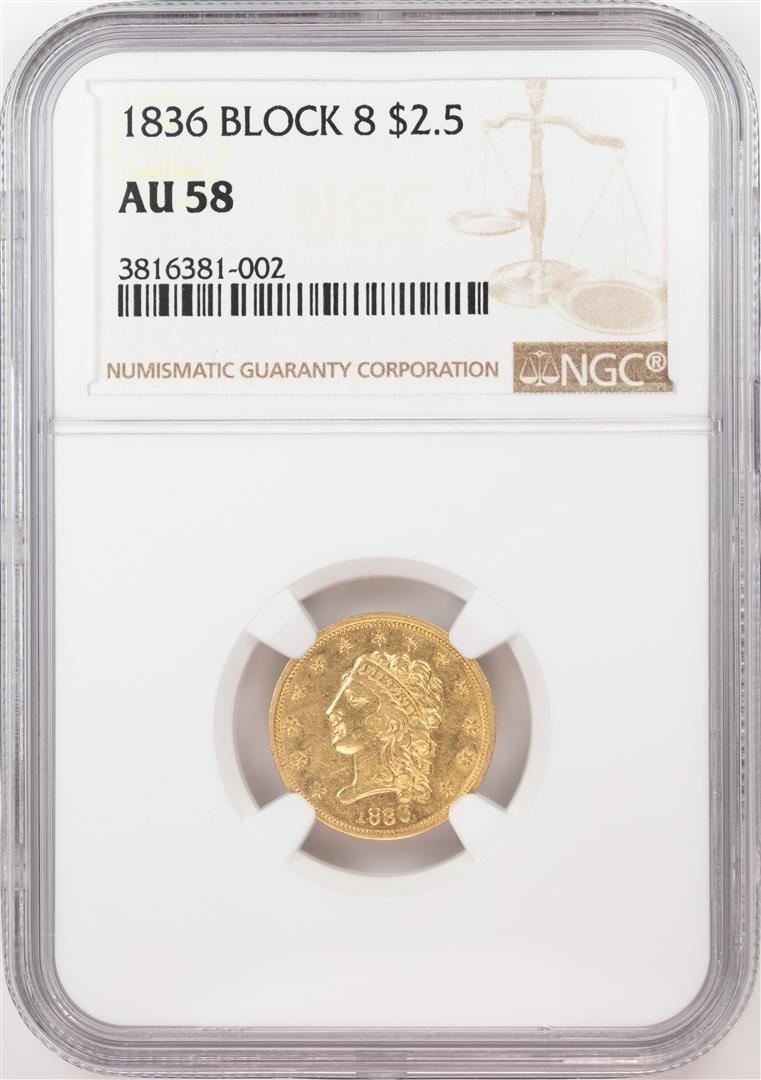 One 1836 Block 8 $2 1/2 Classic Head Quarter Eagle Gold Coin NGC AU58. NGC Certified.