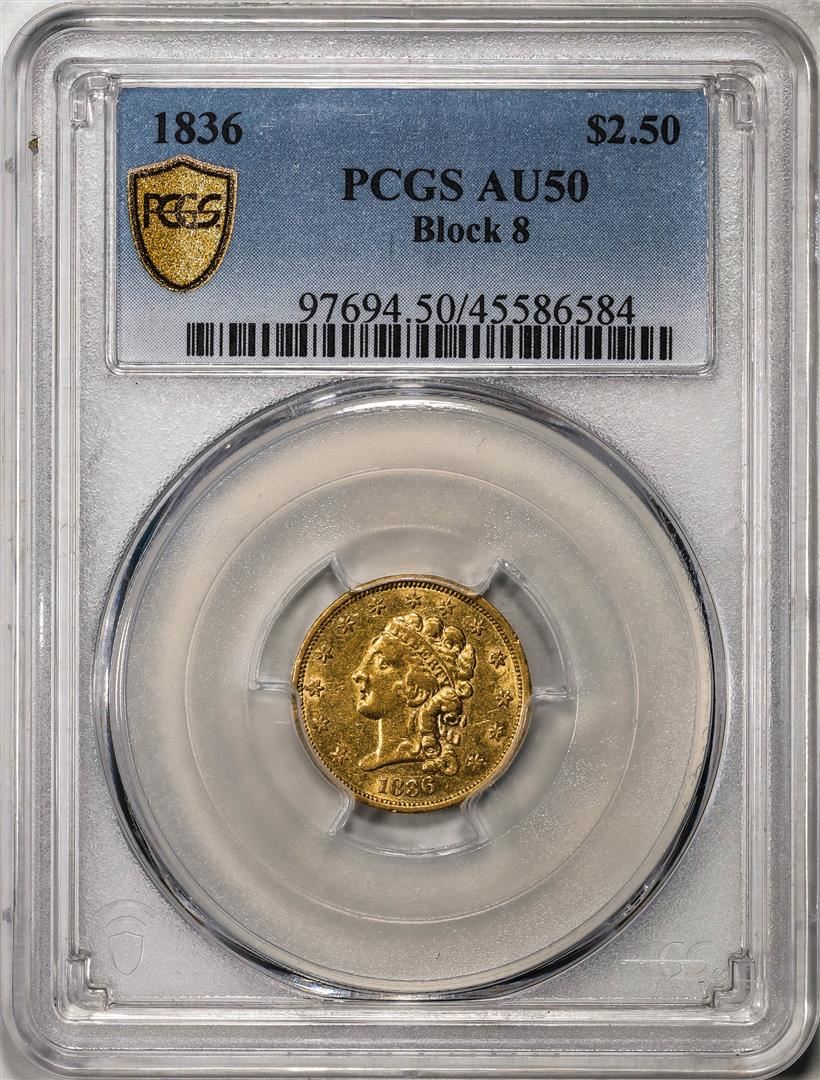 One 1836 Block 8 $2 1/2 Classic Head Quarter Eagle Gold Coin PCGS AU50. PCGS Graded.