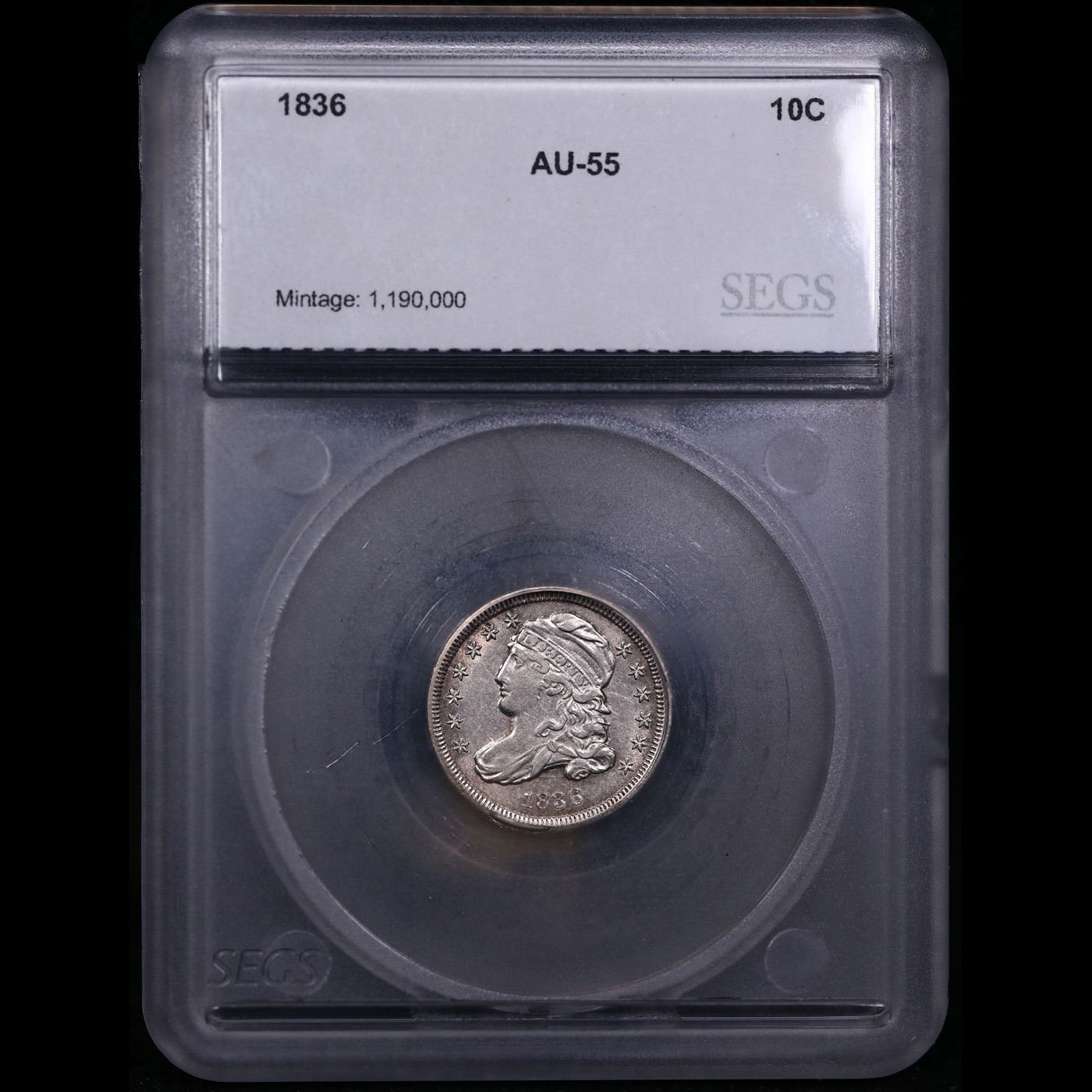 1836 Capped Bust Dime 10c Graded au55 BY SEGS.