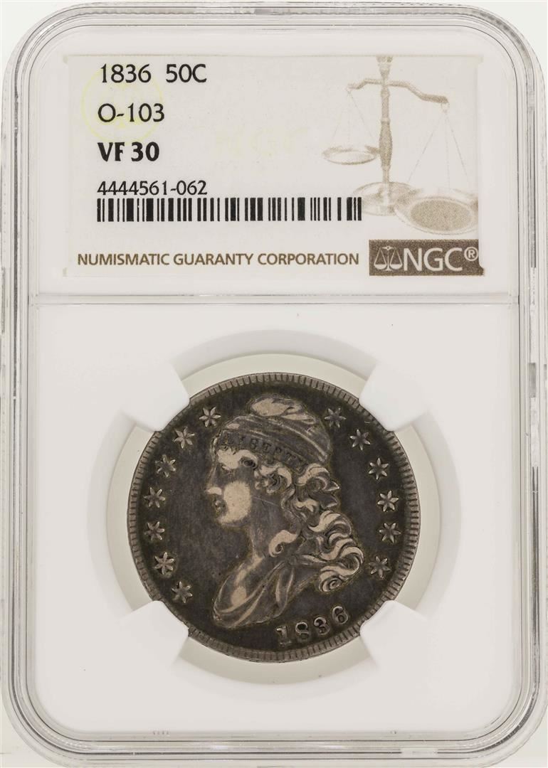 One 1836 Capped Bust Half Dollar Coin O-103 NGC VF30. NGC Certified.