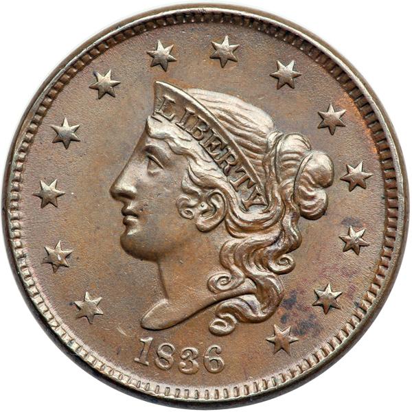 1836 Coronet Head Cent. PCGS graded MS-62 Brown. The obverse is frosty medium brown with hints of faded mint color in a few protected areas plus a small splash of darker olive brown toning between stars 12 & 13. The reverse is a slightly darker frosty bluish steel brown mixed with some medium brown tones. A very tiny abrasion that barely breaks the frost left of the peak of the 1 is the only contact mark visible without a strong glass. LDS with all the reverse die cracks clear, including the final one down from the dentils through the second S in STATES. This is the Wright plate coin for the variety. Called MS60 and tied for CC#3 in the Noyes census, his photo #22022. Bland also says MS60 but tied for CC#9 in his list. Removed from an NGC slab graded MS64BN (NGC label included, and it shows the attribution and Ron Adam provenance). Our grade is MS60. Pop 1; 4 finer; 3 in 64; 1 in 65. Only 5 graded at PCGS for the variety. DWH #3182 (PCGS # 37114) .
