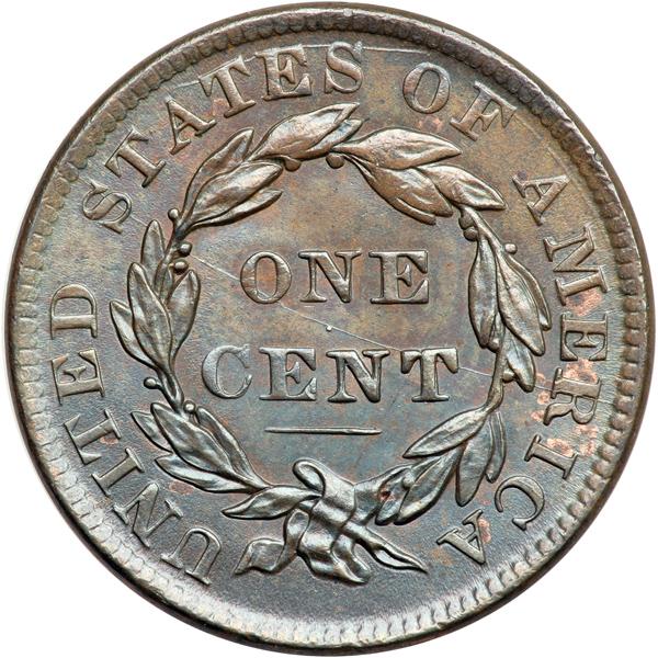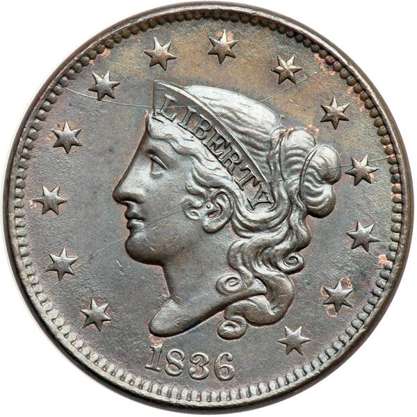 1836 Coronet Head Cent. PCGS graded MS-64 Brown. Lustrous bluish steel brown with traces of mint red remaining on both sides. The surfaces are satiny and quite attractive. No spots, stains, or other defects. M-LDS with a die crack arcing through the coronet to the dentils at stars 5 & 8, another through the top of TES, one at F-AM, and a bisecting die crack from the first S in STATES to the R in AMERICA. The fields are wavy and slightly rough from die flowlines and erosion, especially on the obverse. The dies have not been lapped yet in an attempt to remove this roughness (see next piece), and the repunching on the peak of the 1 is obvious. Called MS60 and tied for CC#3 in the Noyes census, his photo #27362. Removed from an NGC slab graded MS64BN (NGC label included, and it shows the attribution and Reiver provenance). Our grade is MS60+. Pop 1; 1 in 64RB. Only 2 graded at PCGS for the variety. DWH #2942 (PCGS # 37111) .