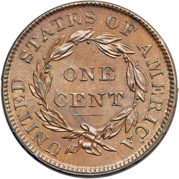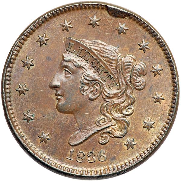 1836 Coronet Head Cent. PCGS graded MS-64 Brown. Lustrous light steel brown. Nice eye appeal with just a couple trivial contact marks, including a dull rim nick at the first A in AMERICA. Sharply struck LDS (but not the terminal state). The cud break over star 8 is bold, a smaller rim cud break shows at star 4, and all 5 of the radial die cracks on the reverse are strong, including the final one through the F to the dentils above. The fine die crack that connects the M to the dentils at either side has not formed. Our grade is AU58. Pop 1; 1 in 66RB. Only 4 graded at PCGS for the variety. DWH #3322 (PCGS # 37126) .