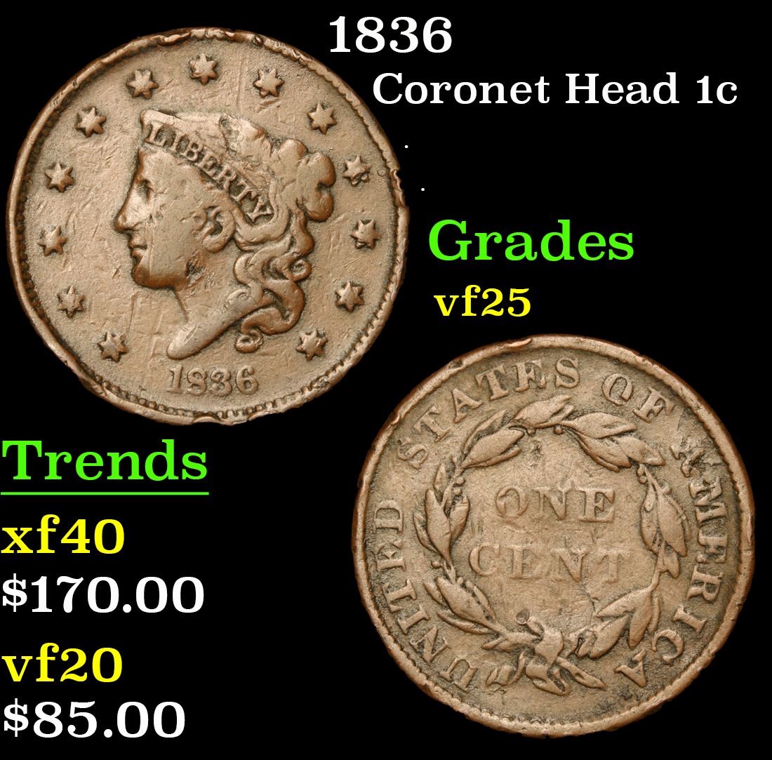 1836 Coronet Head Large Cent 1c Grades vf+.
