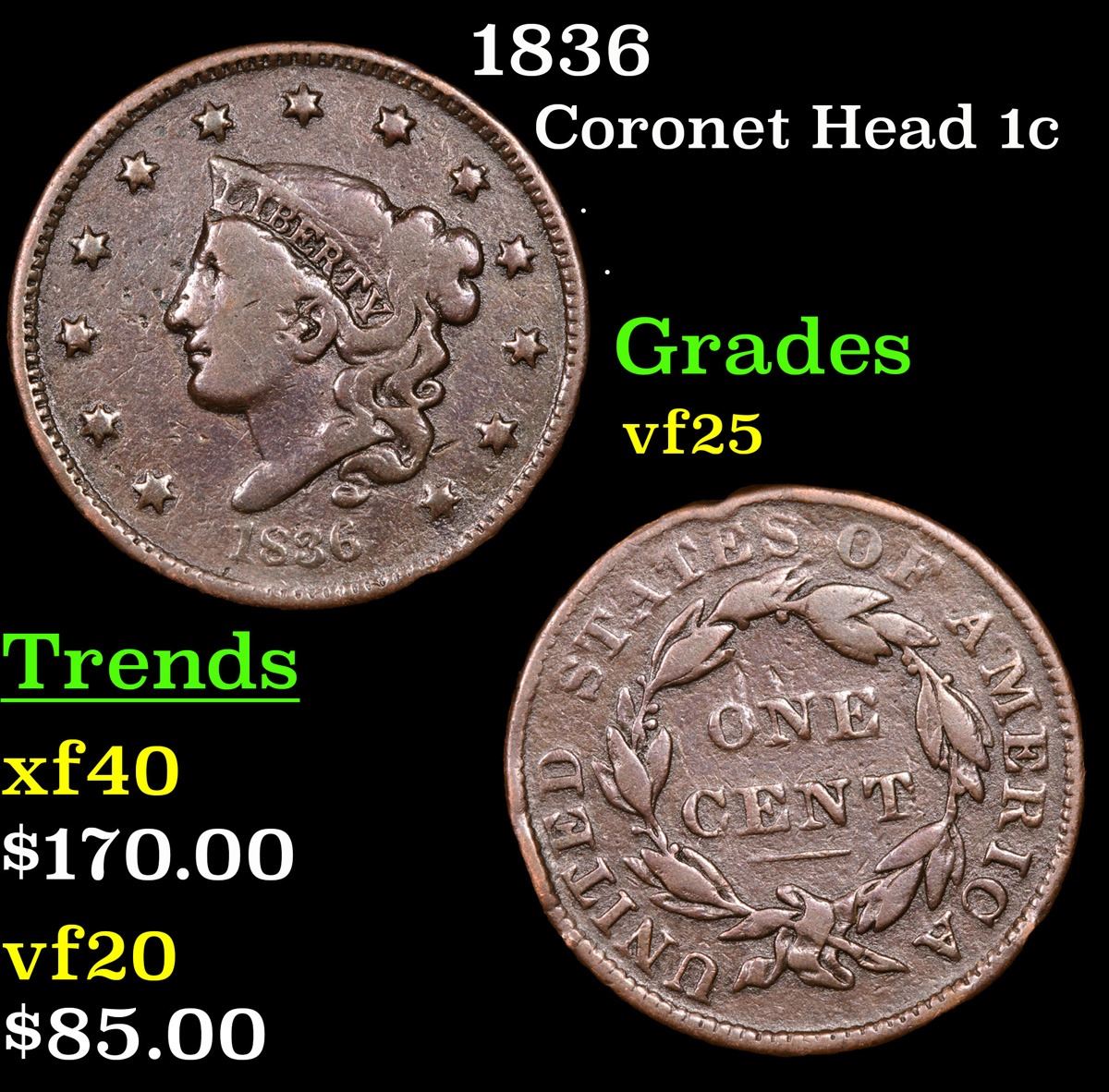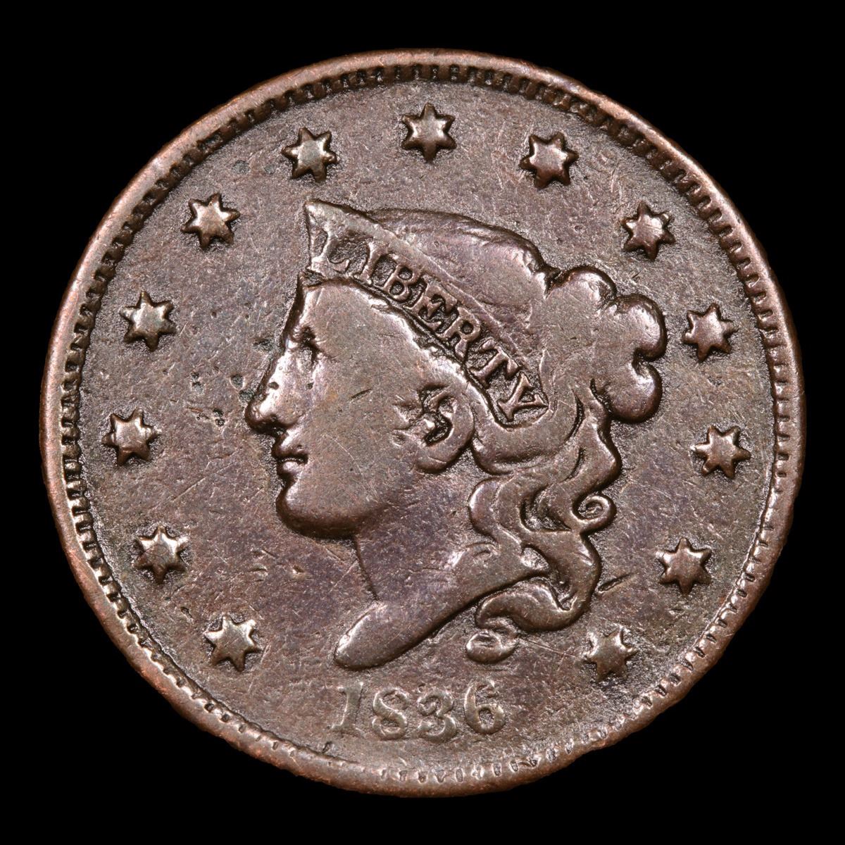 1836 . . Coronet Head Large Cent 1c Grades vf+.