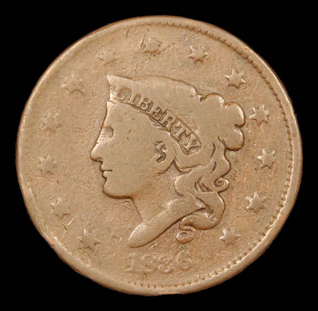 1836 . . Coronet Head Large Cent 1c Grades vg+.