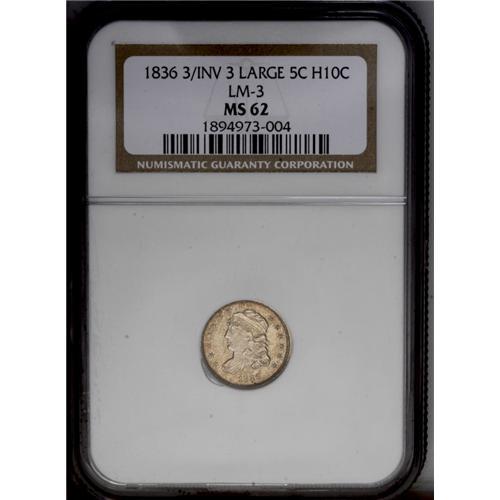 1836 H10C 3/Inverted 3 MS62 NGC. V-4, LM-3, R.1. Light