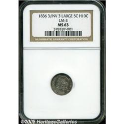 <B>1836 H10C 3/Inverted 3 MS63 NGC.</B></I> V-4, LM-3, R.1. Large 5C. The 3 in the date is struck over an inverted 3, and the U in UNITED is repunched north. Dusky apple-green and deep red hues embrace this satiny and typically struck Select specimen. Lovingly preserved, and a splendid type coin. Struck from mildly rotated dies.
