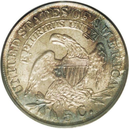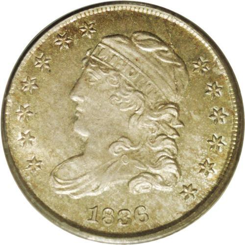 <B>1836<H10C> 3/Inverted 3 MS66 PCGS.</B></I> V-4, LM-3, R.1. Dappled olive-gold toning graces the obverse of this satiny and sharply impressed Premium Gem. Deeper splotches of steel-blue color embrace portions of the reverse border. A bold vertical die crack spans from 1 o'clock to the base of Liberty's hair. Certified in an older green label PCGS holder.