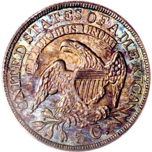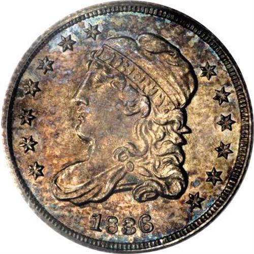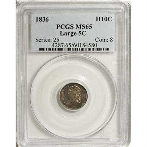 <B>1836 H10C 3/Inverted 3 MS65 PCGS.</B></I> V-4, LM-3, R.1. A popular Large 5C variety that receives a separate Guide Book listing. The base of the U in UNITED is also nicely repunched south. This impressive Gem features dappled golden-brown, yellow-gold, mauve, and electric-blue toning. Attentively struck and satiny with exemplary preservation.<I><BR>From The Beau Clerc Collection.</B></I><BR><BR><B>Coin Engraver:</B> William Kneass<BR><BR><b>Shipping:</b> Coins & Currency (<a target="_blank" href="http://www.heritageauctions.com/common/shipping.php">view shipping information</a>)