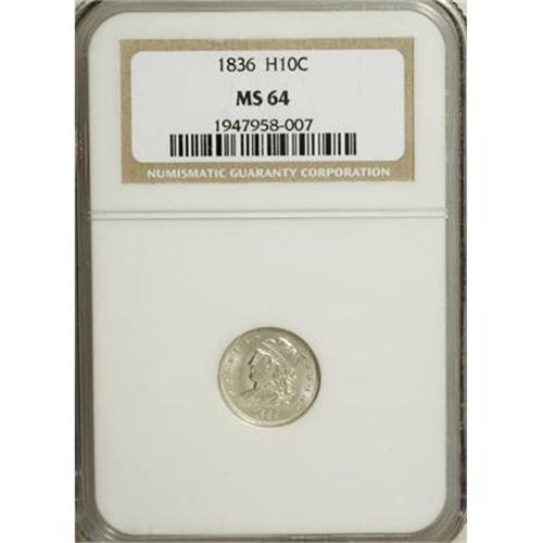 <B>1836 H10C Small 5C MS64 NGC.</B></I> V-6, LM-5, R.2. A well-defined near-Gem with strongly lustrous, essentially untoned silver-white surfaces. On the pleasingly preserved reverse, a die crack arcs through the denomination. Population: 41 in 64, 25 finer (3/08).<BR><BR><B>Coin Engraver:</B> William Kneass<BR><BR><b>Shipping:</b> Coins & Currency (<a target="_blank" href="http://www.heritageauctions.com/common/shipping.php">view shipping information</a>)