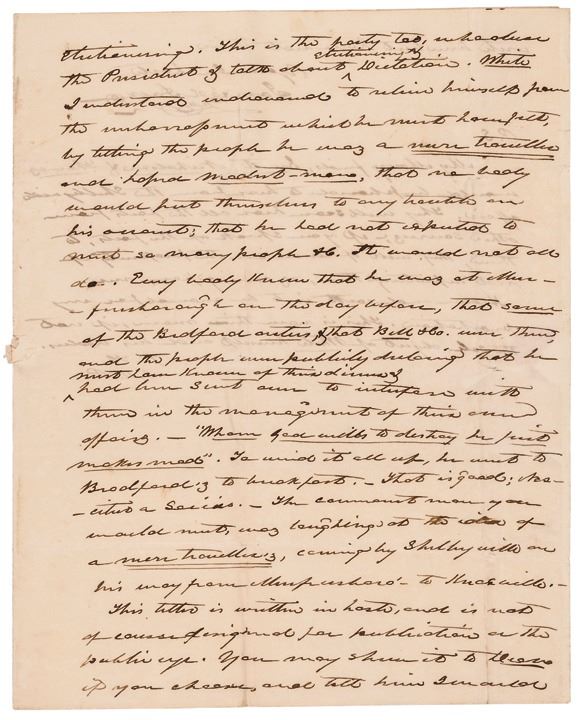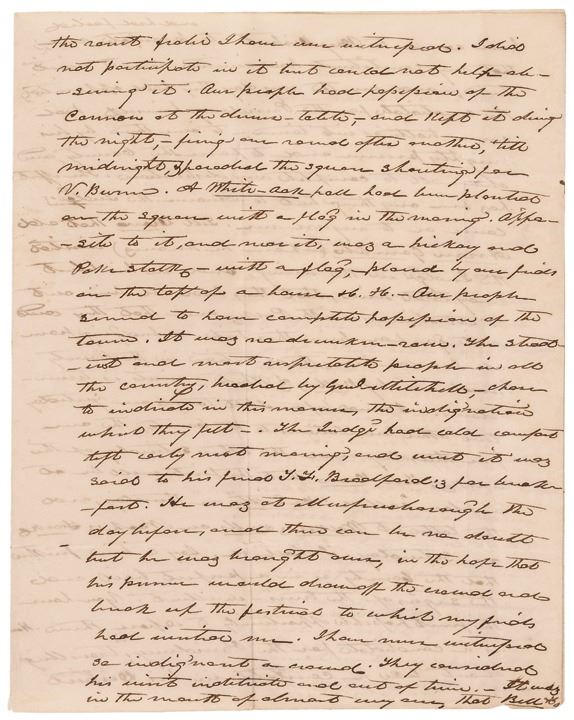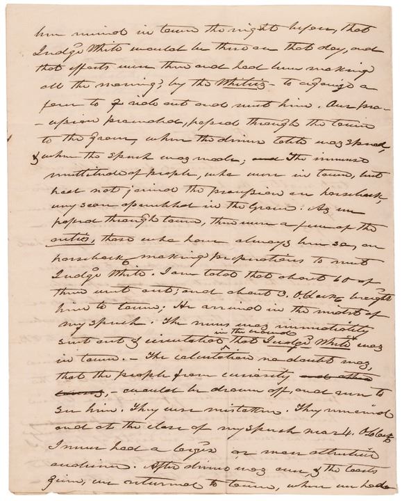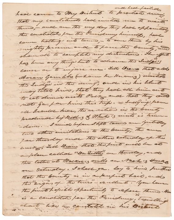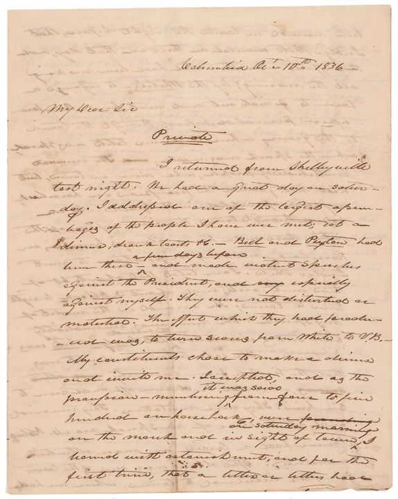 “My Dear Sir --- Private --- I addressed one of the largest assemblages of the people I have ever met; ate a dinner, drank toasts, etc. [John] Bell and [Balie] Peyton had been there a few days before and made instant speeches against the President, and especially against myself. They were not disturbed or molested. The effect which they had produced was to turn scans from White to J.B. My constituents chose to make a dinner and invite me. I accepted, and as the procession -- numbering it was said from four to five hundred on horseback, were on a march and in sight of town on Saturday morning, I learned with astonishment, and for the first time ... that Judge White would be there on that day, and that effects were there and had him making all the morning, by the Whites, to organize a few to ride out and meet him. Our procession proceeded, passed through the town to the square, where the dinner table was spread & where the speech was made; the immense multitude of people, who were in town, but had not joined the procession on horseback, many soon sprinkled in the grass. As we passed through town, there were a few of the antics, those who have always have him seen on horseback making the preparations to meet Judge White. I am told that about 60 of them went out; and about 3 o'clock brought him to town; He arrived in the midst of my speech. The news was immediately sent out & circulated in the crowd that Judge White was in town. The calculation no doubt was, that the people from curiosity would be drawn off, and run to see him. There were mistaken. They remained and at the close of my speech near 4 o'clock I never had a larger or more attentive audience. After dinner was over, & the toasts given, we returned to town, where we had the roust frolic I have ever witnessed. I did not participate in it but could not help observing it. Our people had possession of the cannon at the dinner table -- and kept it during the night -- firing one round after another, 'till midnight, and paraded the square shouting for V. Buren. A White-Bell pole had been planted on the square with a flag in the morning. Opposite to it, and near it, was a hickory and Polkstalk -- with a flag -- placed by our friends in the top of a house &c. &c. Our people seemed to have complete possession of the town. … I have never witnessed so indignant a crowd. ... It was in the mouth of almost every one that Bell & Co. had come to my District ... and had failed. ... The effect has been any thing but to advance the Judge ... or to injure me. ... Judging from all I could hear, the re-action in the County produced by Bell & White ... is tremendous. --- Yours In Haste -- (Signed) James K Polk".