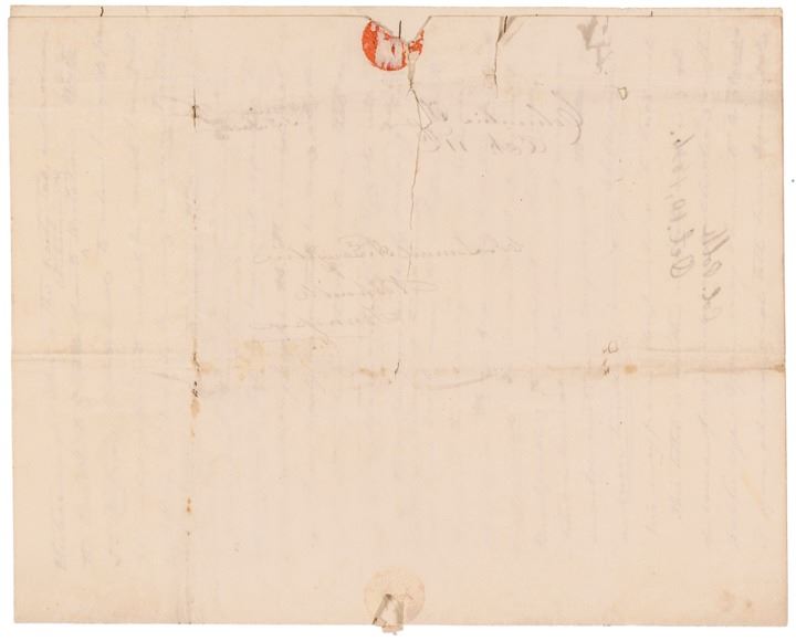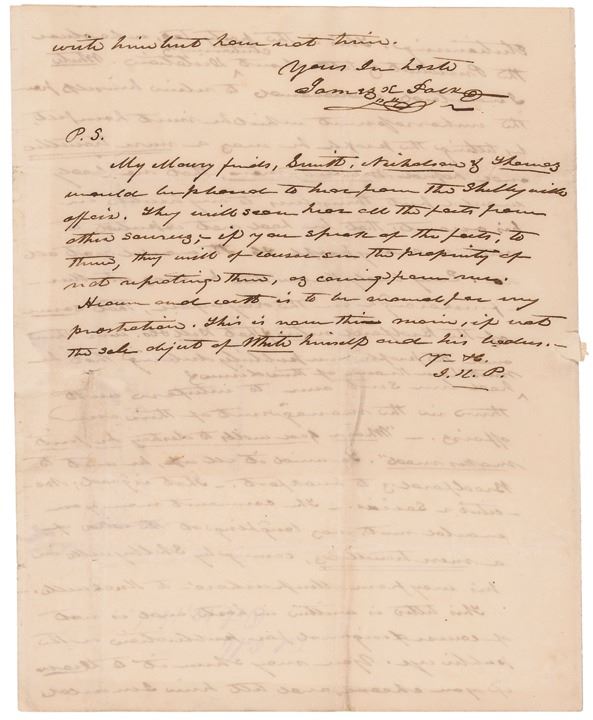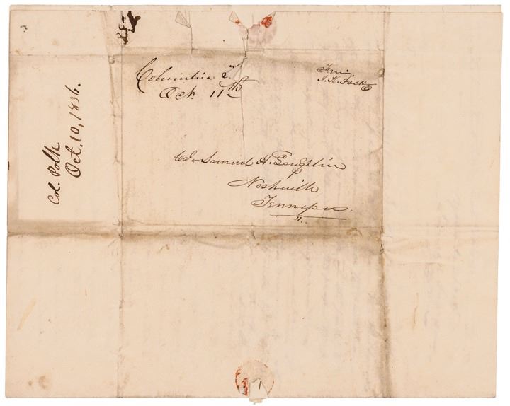 There is a lengthy 9-line Postscript is Initialed, "J.K.P.". The address panel is completely penned in Polk's hand with his additional free frank, "Free J. K. Polk." Some separation of the main vertical fold of page five and six at the upper edge. Remnant of the original wax seal of address leaf where torn when opened resulting in a 2” long tear at its center, not effecting any of the Letter’s text. James Polk discusses his “run-in” with a political opponents, including Judge Hugh Lawson White, who was running as one of the four Whig Party Candidates for President. Polk writes, in part: