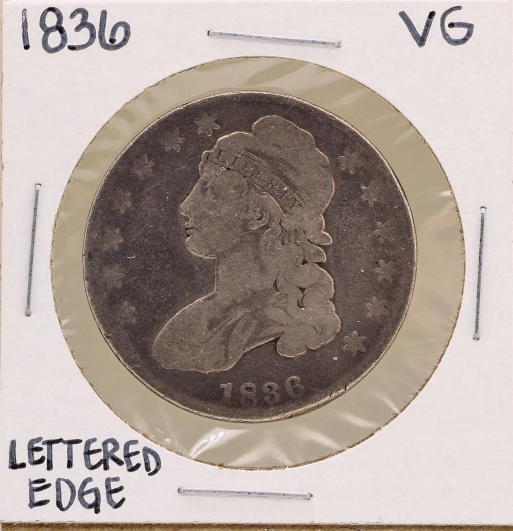 One 1836 Lettered Edge Capped Bust Half Dollar Coin.