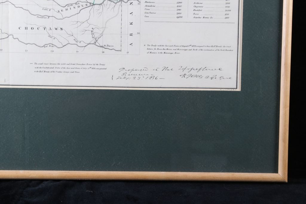 For your consideration is this 1836 Map of Emigrant Indians West of Ar. and Mo. This map is in pristine display/ museum quality condition showing a variety of tribes and their ascribed relocations during the 1830's. This is an official record and is shown in a reliable and well constructed wood frame. From the renowned Sundog Fine Art Bozeman, Montana collection and collected by Bruce VanLandingham. Bruce VanLandingham was a pillar in the American Indian collecting community and a respected expert. Along with being an avid collector Bruce also was the sole owner of Sundog Fine Art Gallery in Bozeman which was both part museum and gallery. The measurements of this framed map are 27" x 23".