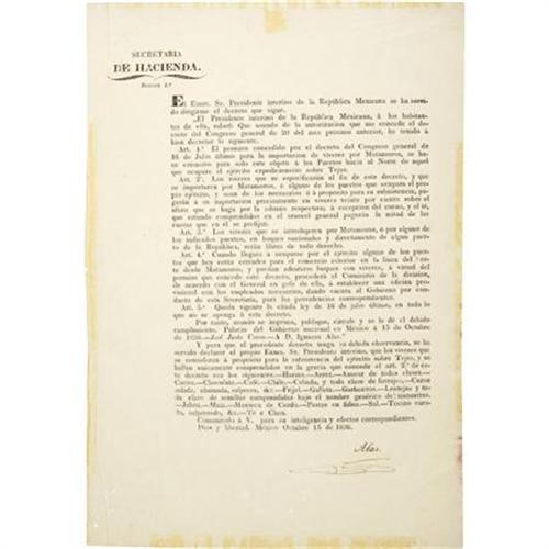 <B>[Broadside] Decree Establishing a Commissary Department for the Army Now Proceeding To Texas.</B></I> [Mexico] October 15, 1836. With heading: <I>SECRETARIA DE HACIENDA. SECCION 1.a</B></I>. One page. Folio. Dated and signed in print at the end: "<I>Mexico a 15 de Octubre de 1836.-- Jose Justo Corro.-- A D. Ignacio. Alas.</B></I>" Followed by postscript also dated October 15, 1836 and signed in print "<I>Alas</B></I>"<I> </B></I>as Secretary of the Treasury, with his holograph rubric below. This law was written to acquire and transport supplies that would support the army that was then preparing to re-invade Texas. Listed here are general types of provisions that are expected to be procured and distributed appropriately to the troops: corn meal, rice, sugar of all types, cocoa, chocolate, coffee, tea, corn, beans, meat, and spices. Encased in a green half-calf folder with marbled boards and gilt lettering on the spine. Old tape stains at extreme outer edges, otherwise in fine condition. This would make a wonderful addition to any Texana or Mexican army collection! <I>From the Darrel Brown Collection.</B></I><BR><BR><B>Reference: </B></I>Streeter 885 (locating only the Bancroft copy).<BR><BR><b>Shipping:</b> Books & Catalogs (<a target="_blank" href="http://www.heritageauctions.com/common/shipping.php">view shipping information</a>)<BR><BR><B>Important n