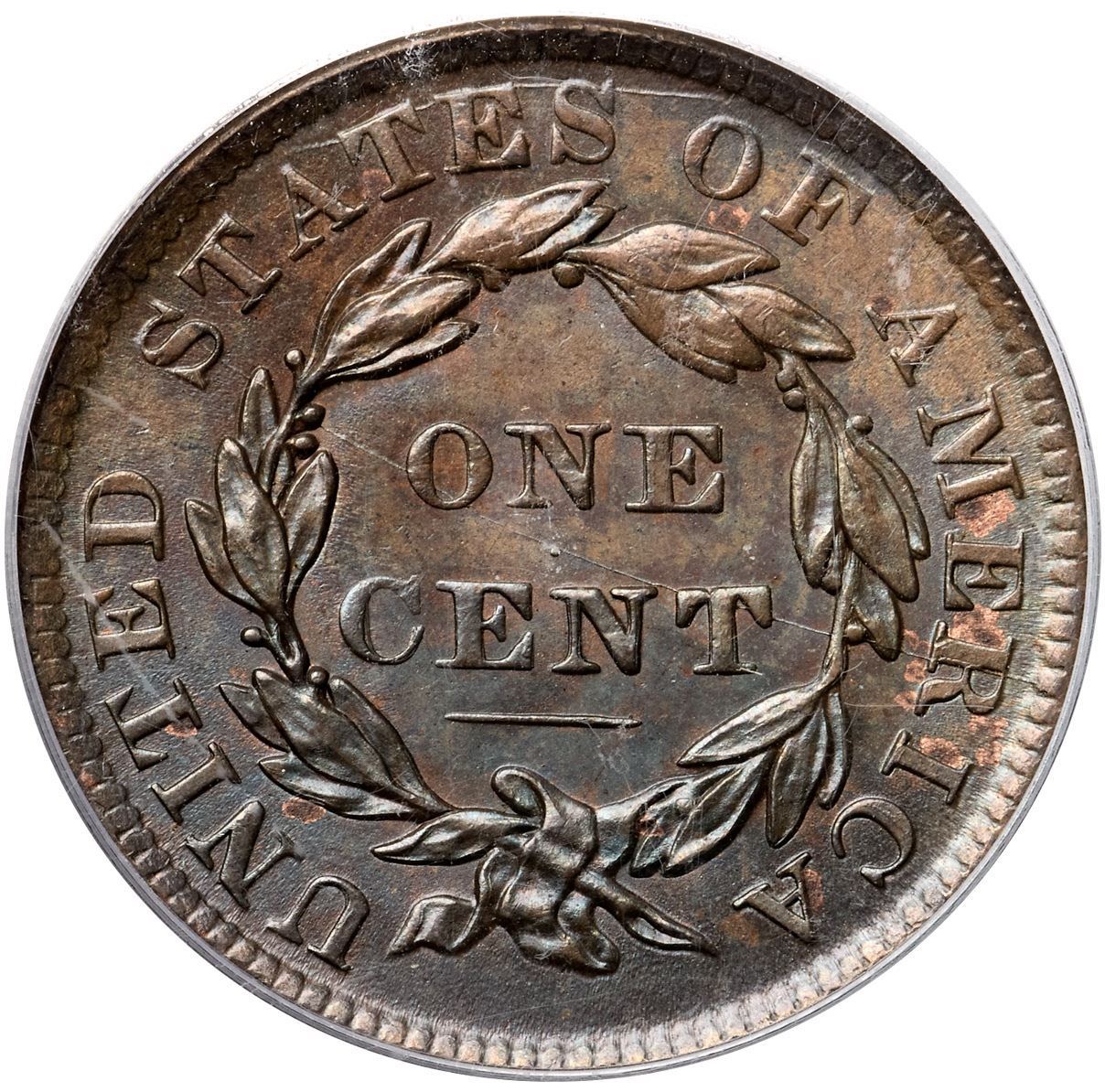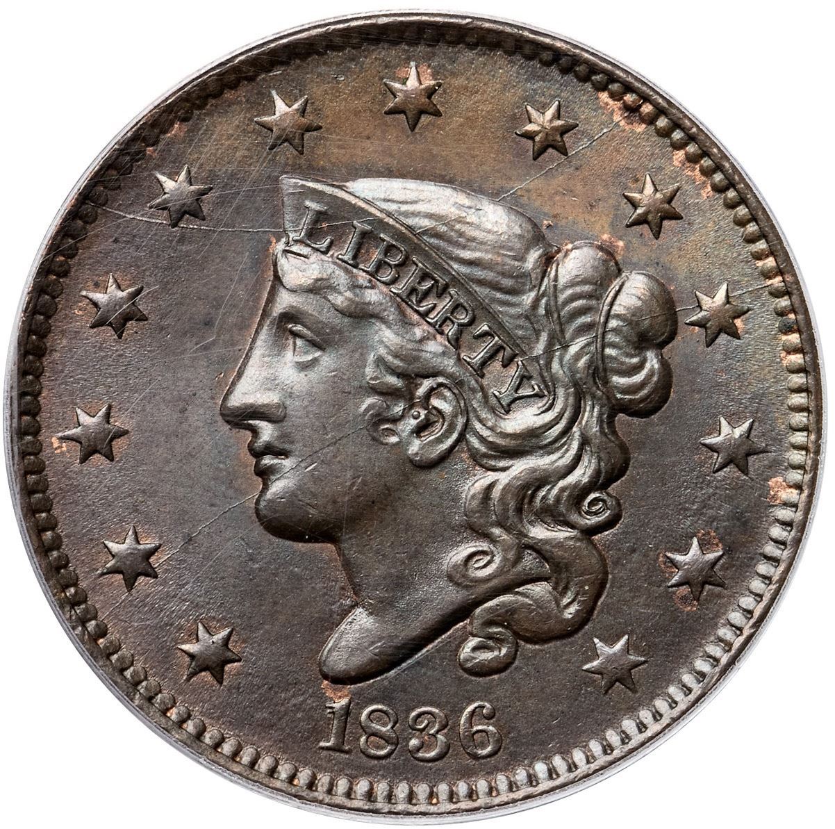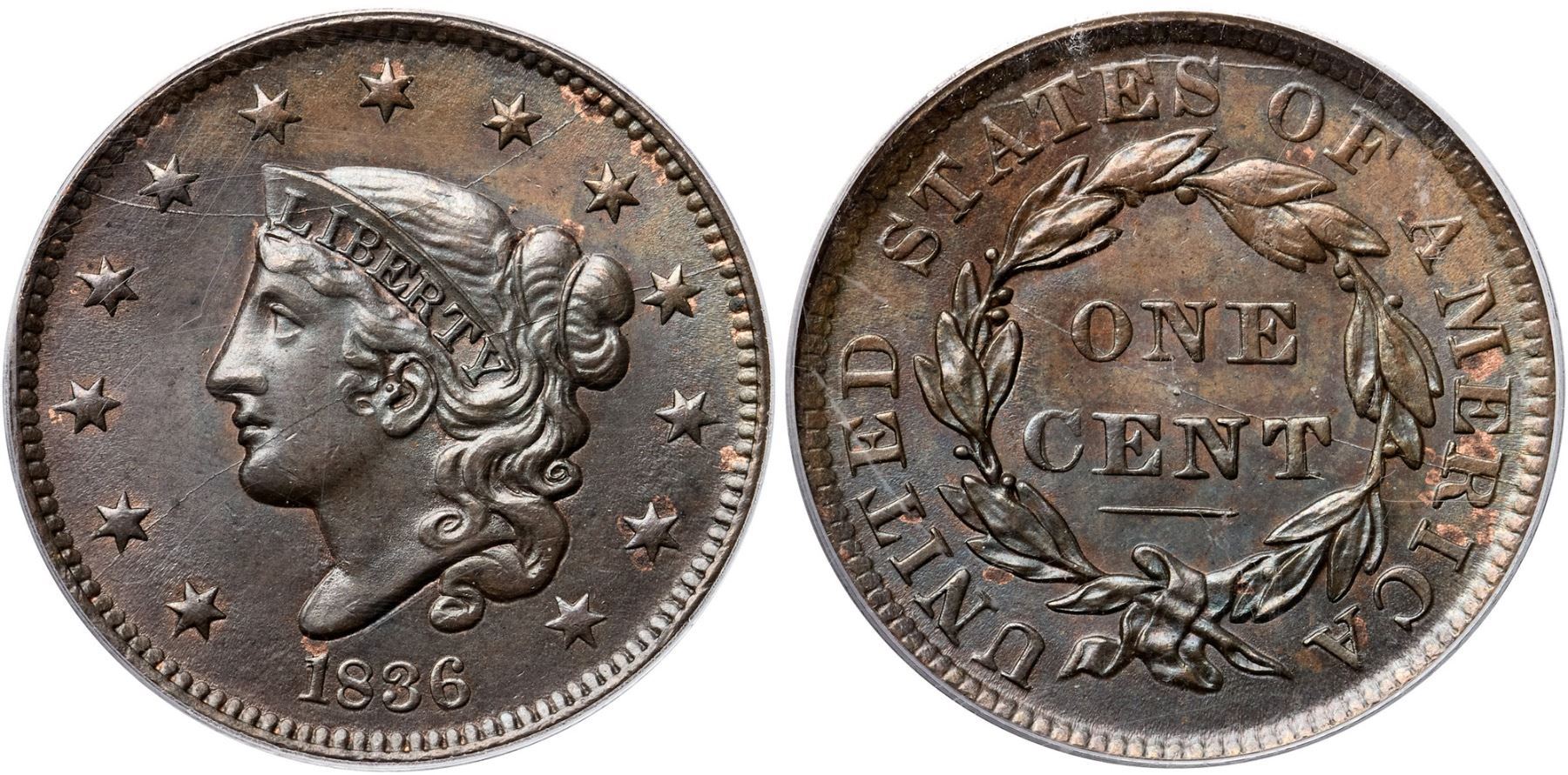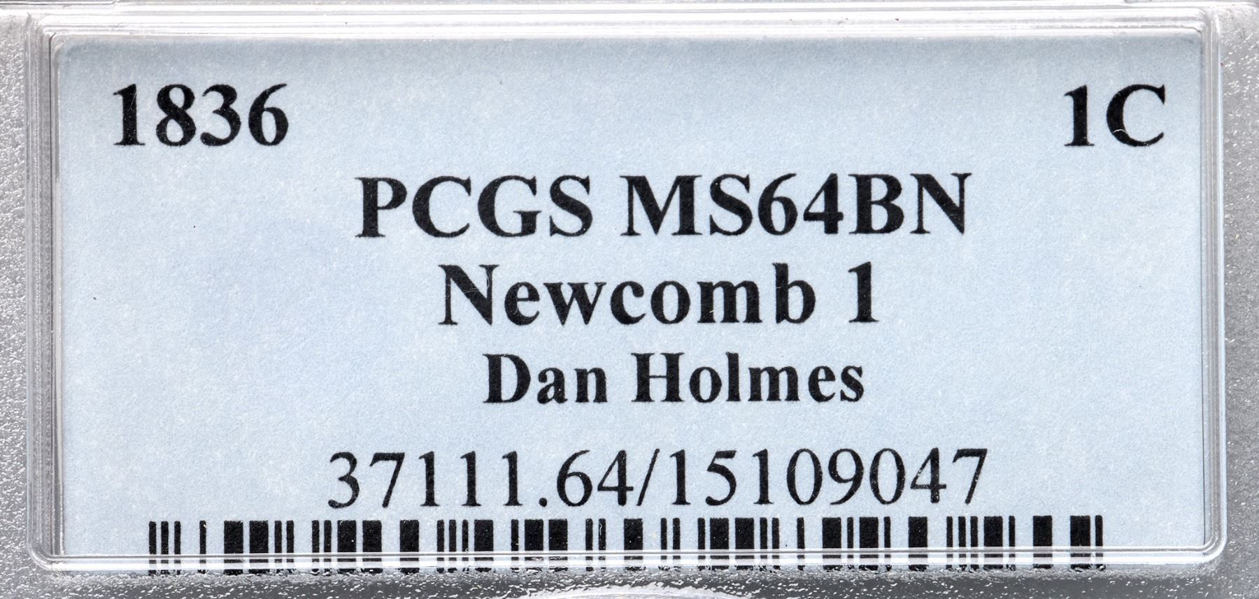 1836 N-1 R1+ PCGS graded MS64 BrownLustrous bluish steel brown and light olive with traces of red remaining on both sides. The surfaces are satiny and this cent has very nice eye appeal. There are some small spots of lighter and darker toning on both sides including one between the top of the 1 and the bust, and the only notable contact mark is a tiny tick on the right top of the C in CENT. LDS with a die crack arcing through the coronet to the dentils at stars 5 & 8, another through the top of TES, one at F-AM, and a bisecting die crack from the first S in STATES to the R in AMERICA. The fields are wavy and slightly rough from die flowlines and erosion, especially on the obverse. The dies have not been lapped yet in an attempt to remove this roughness, and the repunching on the peak of the 1 is clear. Called MS60 and tied for CC#4 in the Noyes census, his photo #27362. Our grade is MS60+.Certificate Number: 37111.64/15109047Pedigree: Ex George Ramont-Jules Reiver, Heritage Auctions 1/24/2006:20049-Daniel W. Holmes, Jr., McCawley & Grellman Auctions/Goldbergs 5/30/2010:446-Terry S. Denman Collection