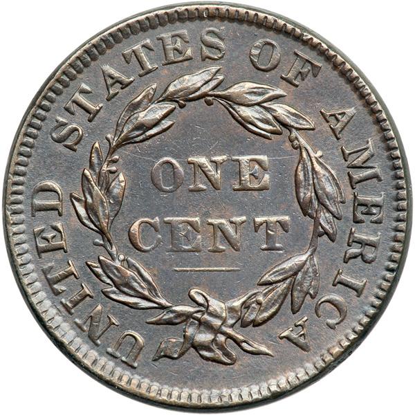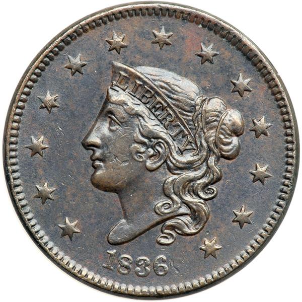 1836 N-3 R1 EF40. EF-40. Glossy dark chocolate brown and steel with frosty flowline luster in protected areas and small splash of reddish brown toning left of star 8. The only notable mark is a light rim bruise at CA. MDS with a fine bisecting die crack arcing across the reverse from the first S in STATES to the left side of the M in AMERICA, but without the cud break at star 6. The fine die line from the M to the berry below is still visible. DWH #0848.