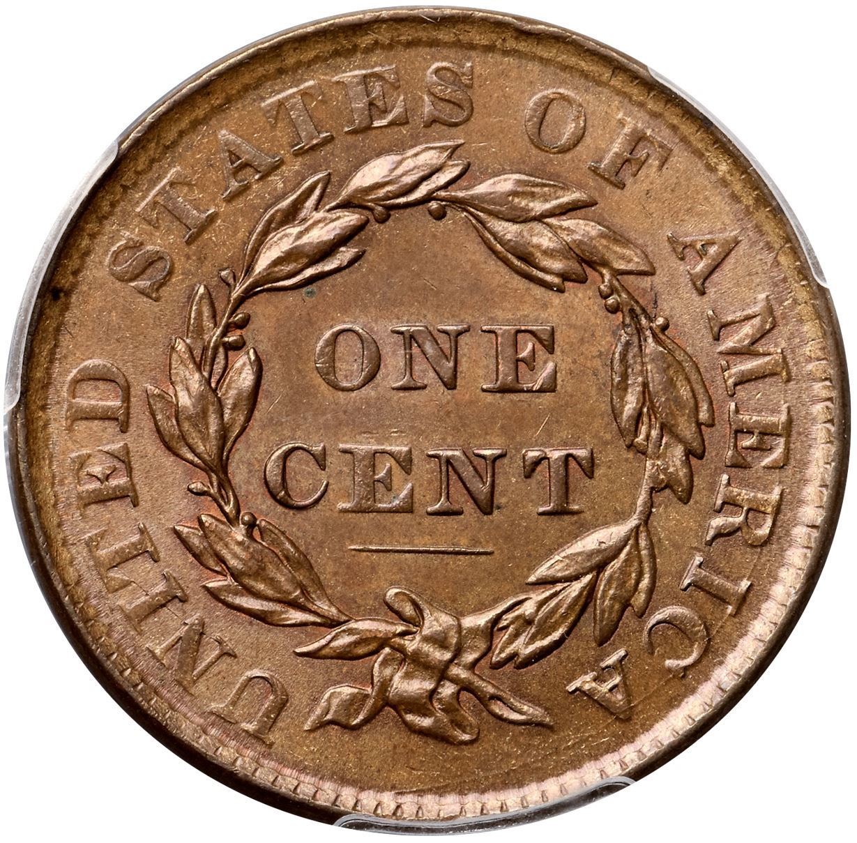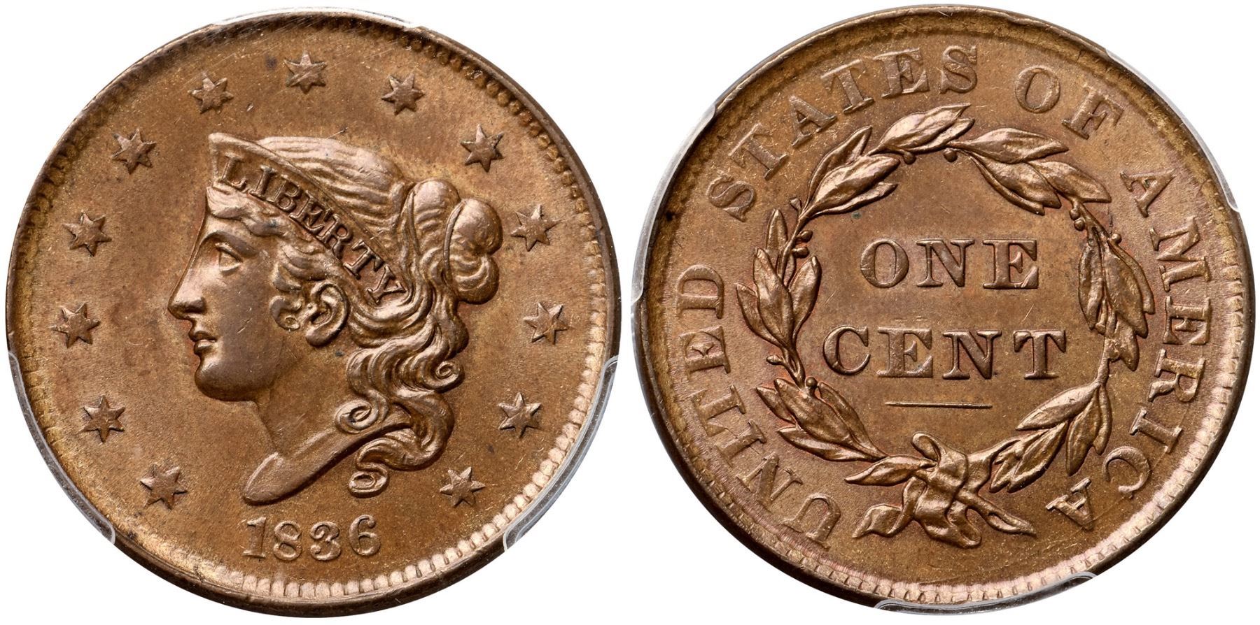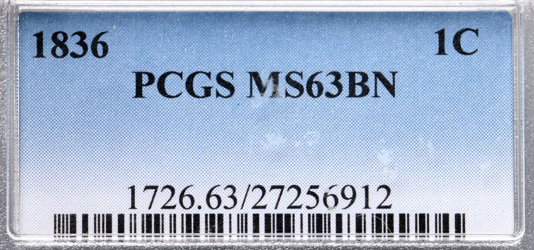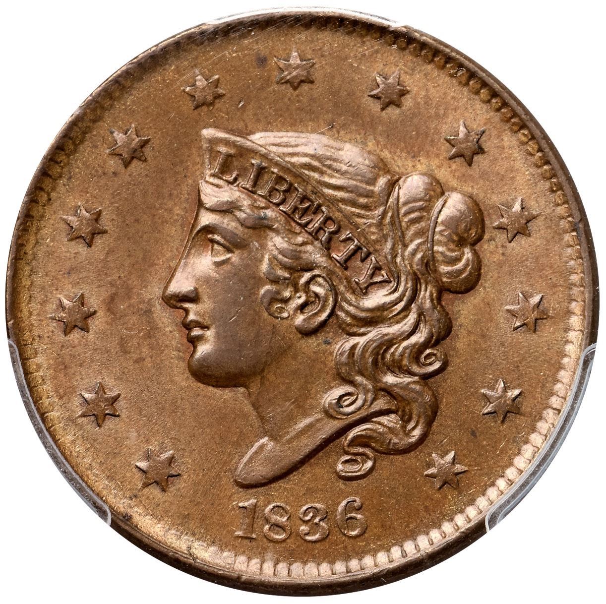 1836 N-5 R3 PCGS graded MS63 BrownLustrous light brown and golden tan with tiny peeps of faded mint red in some protected areas on both sides. Only a few trivial marks including a speck of darker toning left of star 7 and another in the dentils left of the first S in STATES. Looks mint state and the eye appeal is very nice, but there is a hint of rub on the very highest points of the portrait. E-MDS, die state c, with a die crack at OF AMERICA but the base of the E in STATES is still complete. Our grade is AU58. (The back of the holder is scuffed.)Certificate Number: 1726.63/27256912Pedigree: Ex Thomas D. Reynolds 8/15/2013-Terry S. Denman Collection