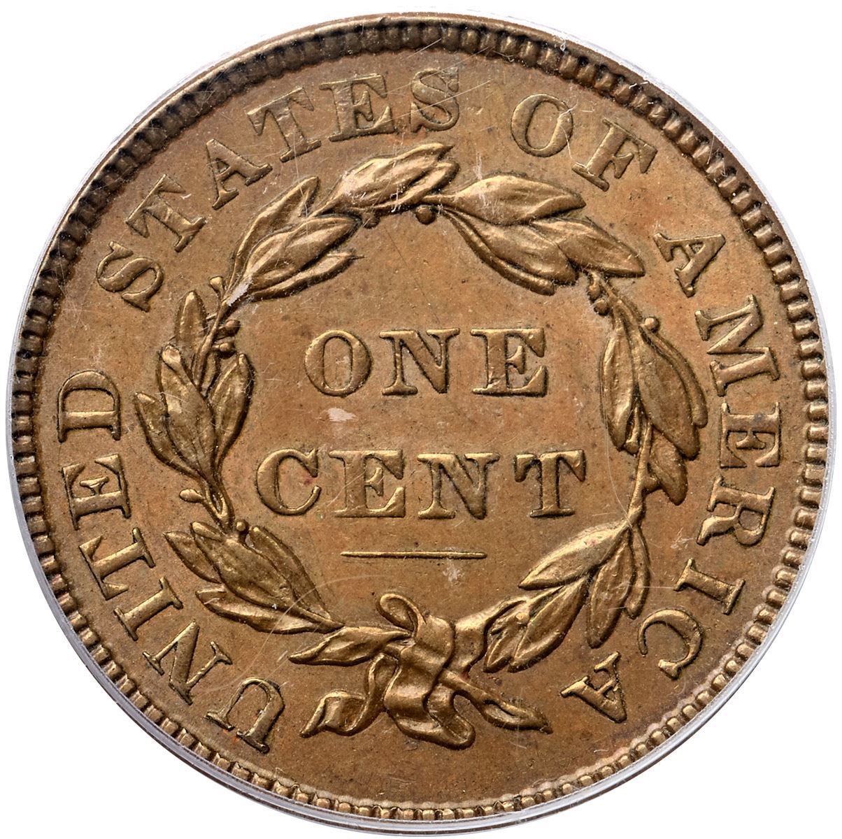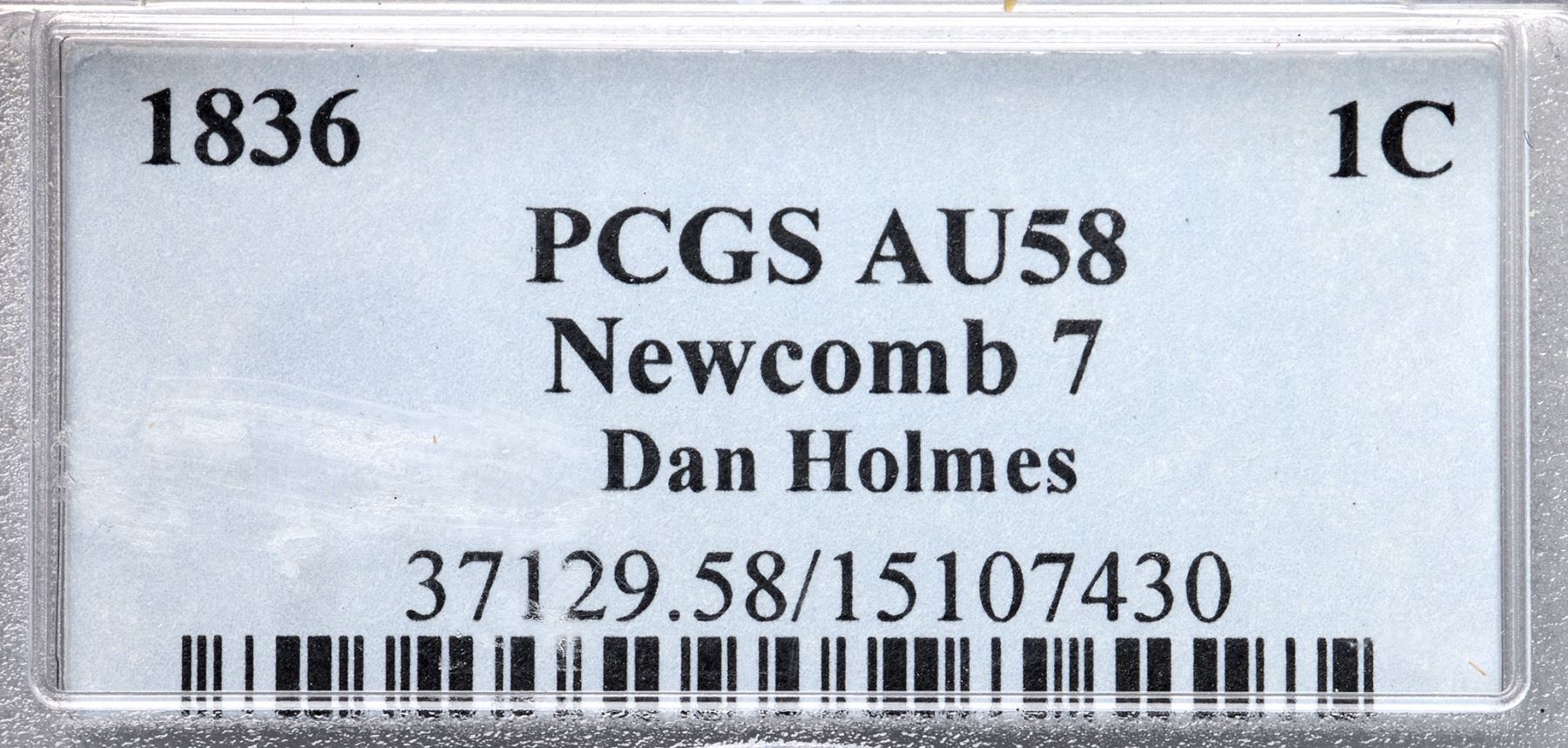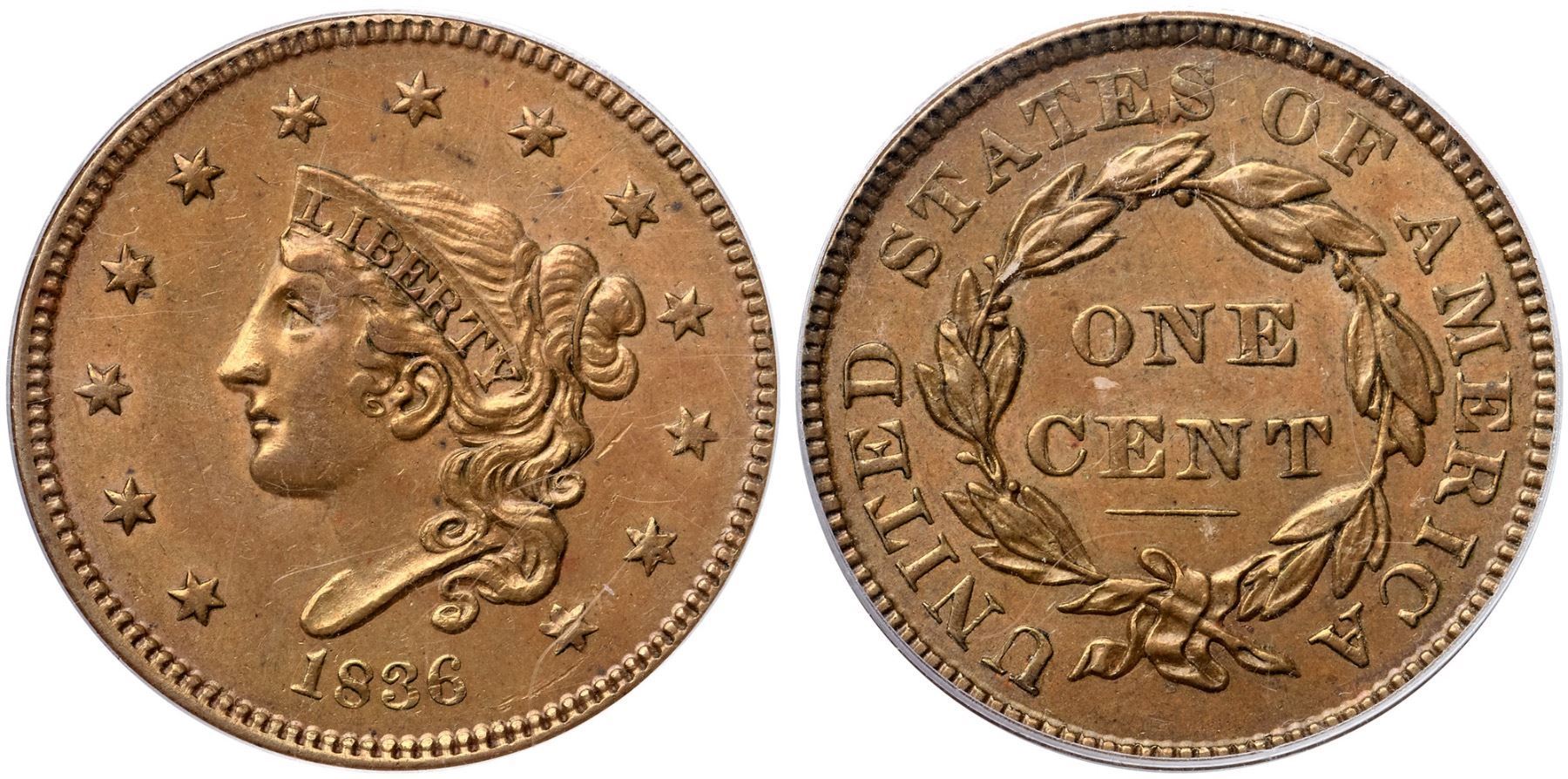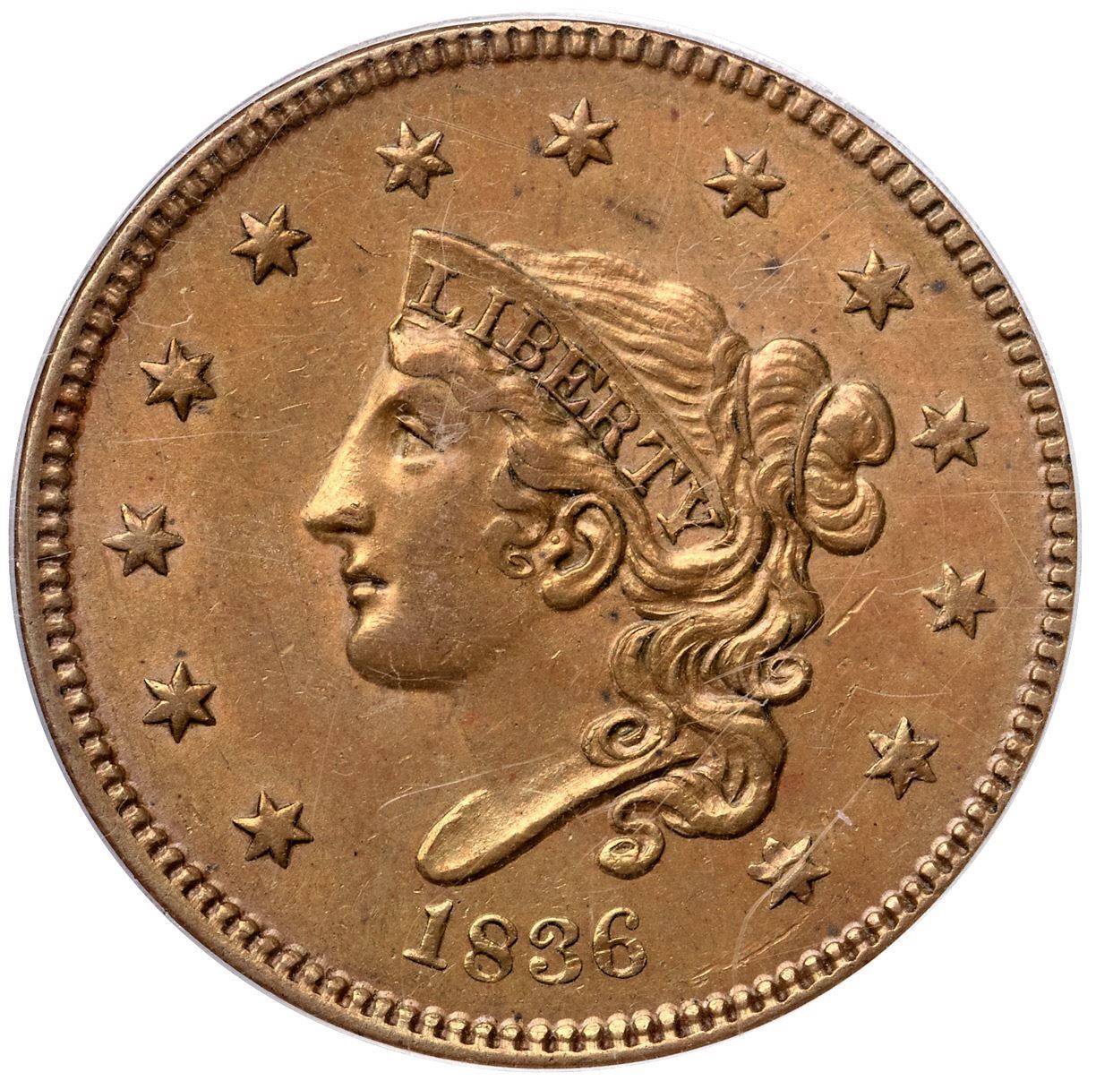 1836 N-7 R4 Gobrecht Head, PCGS graded AU58Lustrous tan and golden light brown. Mint frost shows in the fields and protected areas and this cent has very nice eye appeal. Just a few minor marks including a thin diagonal nick in the field right of the main curl and a dull nick on the inside points of star 13. The reverse is choice with light friction on the highpoints. MDS with a fine die crack from the dentils over the T in UNITED through the top of that D to the top of ST in STATES. The rim cud break at D-STA seen in the later state has not formed. Noyes photo #60996. Graded AU50 by Bland. Our grade is AU50. (The holder is scuffed.)Certificate Number: 37129.58/15107430Pedigree: Ex McLaughlin & Robinson Auctions 9/1984:489-Robert E. Matthews, Superior 5/28/1990:785-Ron E. Adam, McCawley & Grellman Auctions/Superior 9/4/2004:953-McCawley & Grellman Auctions/Goldberg’s 2/10/2008:1521-Daniel W. Holmes, Jr., McCawley & Grellman Auctions/Goldbergs 5/30/2010:459-Terry S. Denman Collection