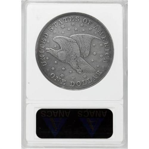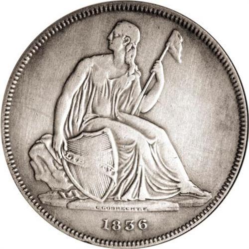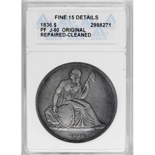<B>1836 P$1 Name on Base, Judd-60 Original, Pollock-65, R.1--Repaired, Cleaned--ANACS. Fine 15 Details.</B></I> Silver. Plain Edge. Die Alignment I (Liberty's head opposite DO). One of 400 pieces struck in early December 1836. All these coins were struck with a proof finish, even though they were intended for circulation. There is no trace of the die scratch on the reverse, which would identifies late December strikings. The fields have been smoothed and each side is notably hairlined. However, the cleaning must have occurred quite a few years ago as the surfaces have since taken on a light gray patina with deeper accents around the devices and margins.<BR><BR><b>Shipping:</b> Coins & Currency (<a target="_blank" href="http://www.heritageauctions.com/common/shipping.php">view shipping information</a>)