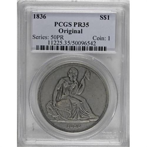 <B>1836 P$1 Name on Base, Judd-60 Original, Pollock-65, R.1, PR35 PCGS.</B></I> Silver. Plain Edge. Die Alignment I (Liberty's head opposite DO). This early December striking shows the eagle flying upward with a coin<I> </B></I>turn. Only 400 pieces are believed to have been produced in this first striking period. While it is generally accepted that the 1836 dollars were struck as circulating proofs, there is no evidence remaining of such a finish on this coin. The fields show a uniform, light gray color, the same as the highpoints of the design. The recesses are a deeper charcoal gray. Several contact marks are scattered over each side, the most obvious ones in the right obverse field and in the fields above and below the eagle. Even wear over the design motifs on each side.<BR><BR><b>Shipping:</b> Coins & Currency (<a target="_blank" href="http://www.heritageauctions.com/common/shipping.php">view shipping information</a>)