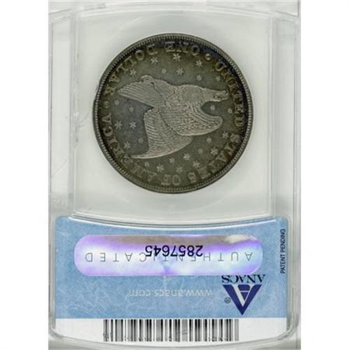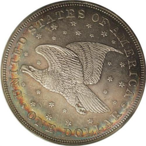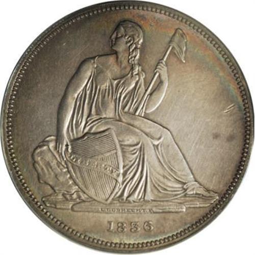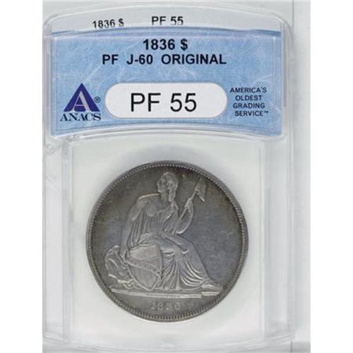 <B>1836 P$1 Name on Base, Judd-60 Original, Pollock-65, R.1, PR55 ANACS.</B></I> Silver. Plain Edge. Die Alignment IV (medallic turn, center of Liberty's head opposite right side of F in OF). Sometimes called Second Original strikings, these coins were struck in March 1837, even though they are dated 1836. Struck as circulating proofs, as were all Gobrecht dollars. There were 600 March strikings, and as has been often told, the coins began in Die Alignment II (medal alignment, Liberty's head opposite the DO in DOLLAR). Apparently, the reverse die was loose and during the production run slowly rotated from the eagle in the “onward and upward” position to level (as in this case with the Die Alignment IV coins).<BR> This is a lightly handled proof whose fields retain almost all of the original reflectivity. Well detailed throughout, with just the slightest bit of highpoint friction. Close examination shows a few widely scattered field marks, but the only mentionable abrasions are a couple of short, shallow digs in the obverse field, near the rim at 3 o'clock. Light gray patina covers most of each side except the peripheries, which show lovely iridescence.<BR><BR><b>Shipping:</b> Coins & Currency (<a target="_blank" href="http://www.heritageauctions.com/common/shipping.php">view shipping information</a>)